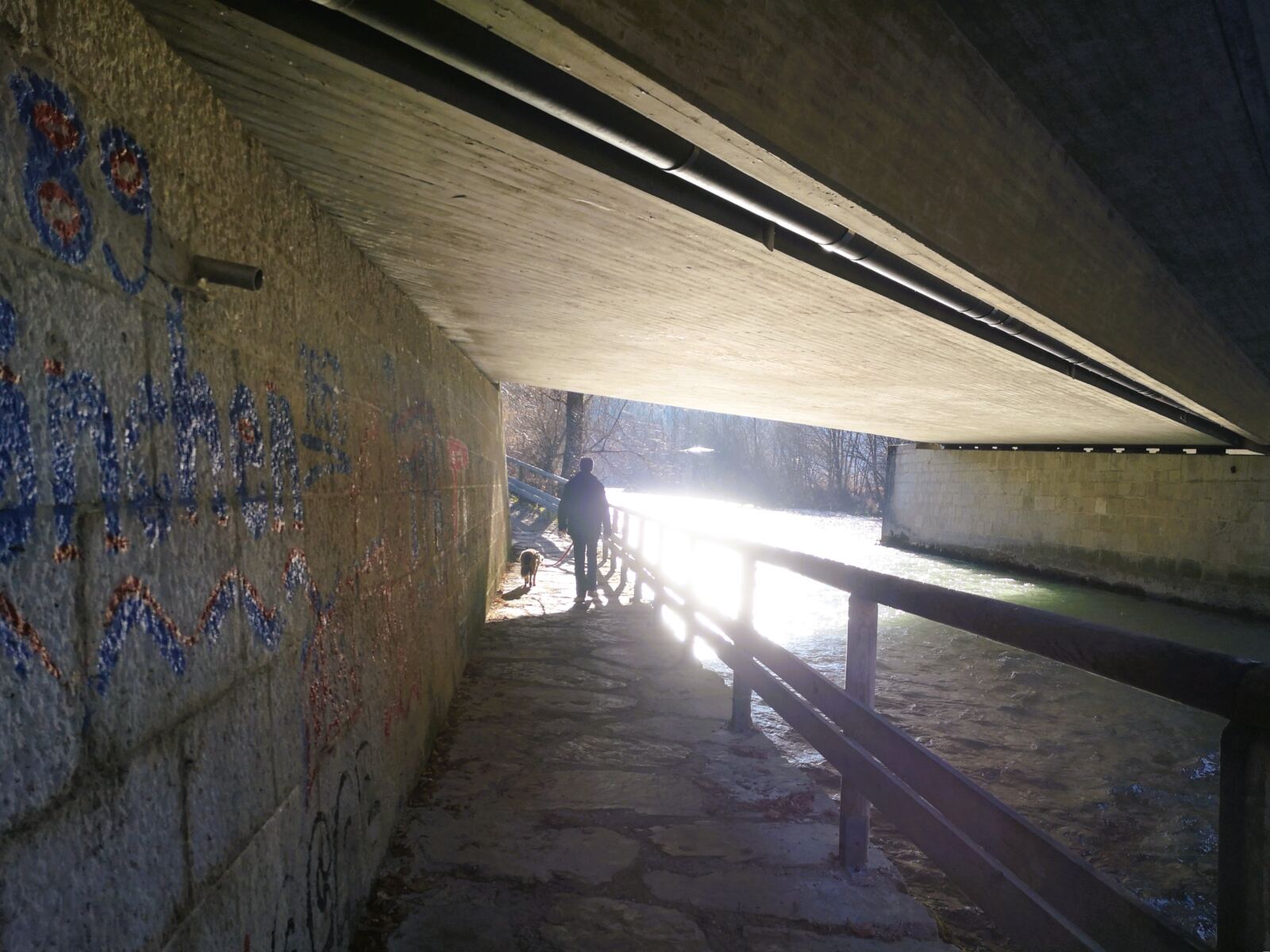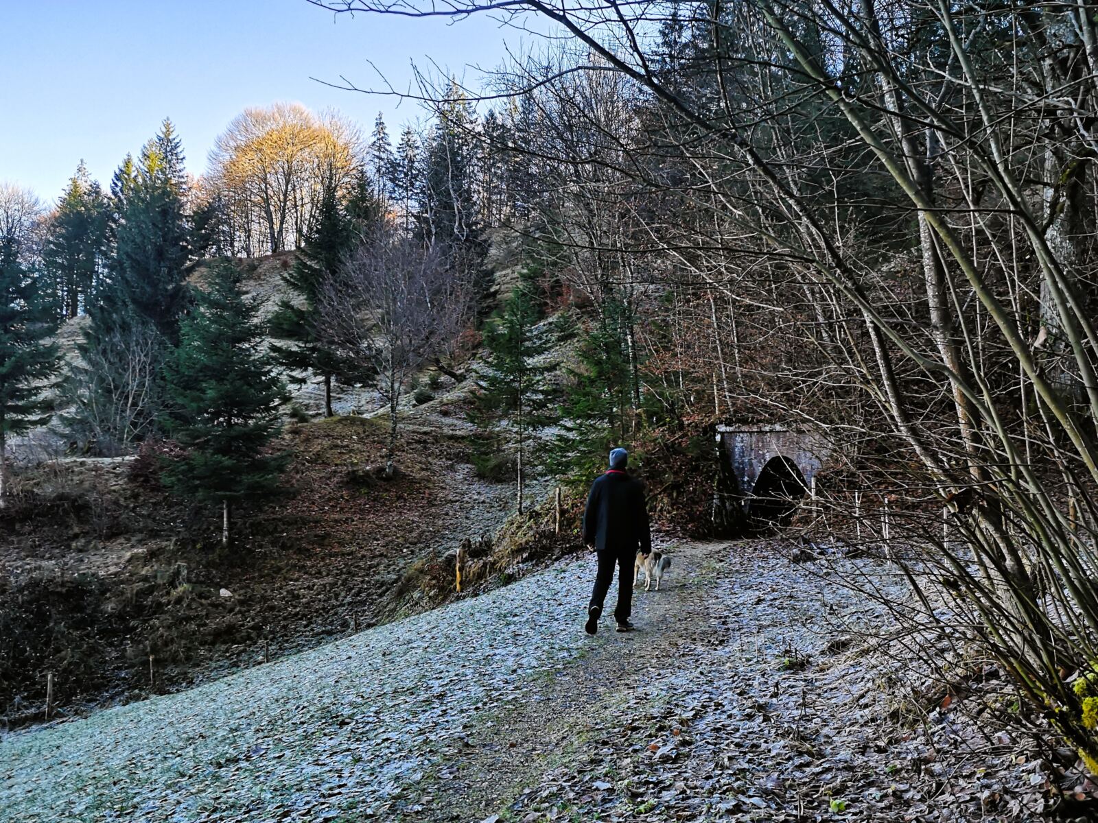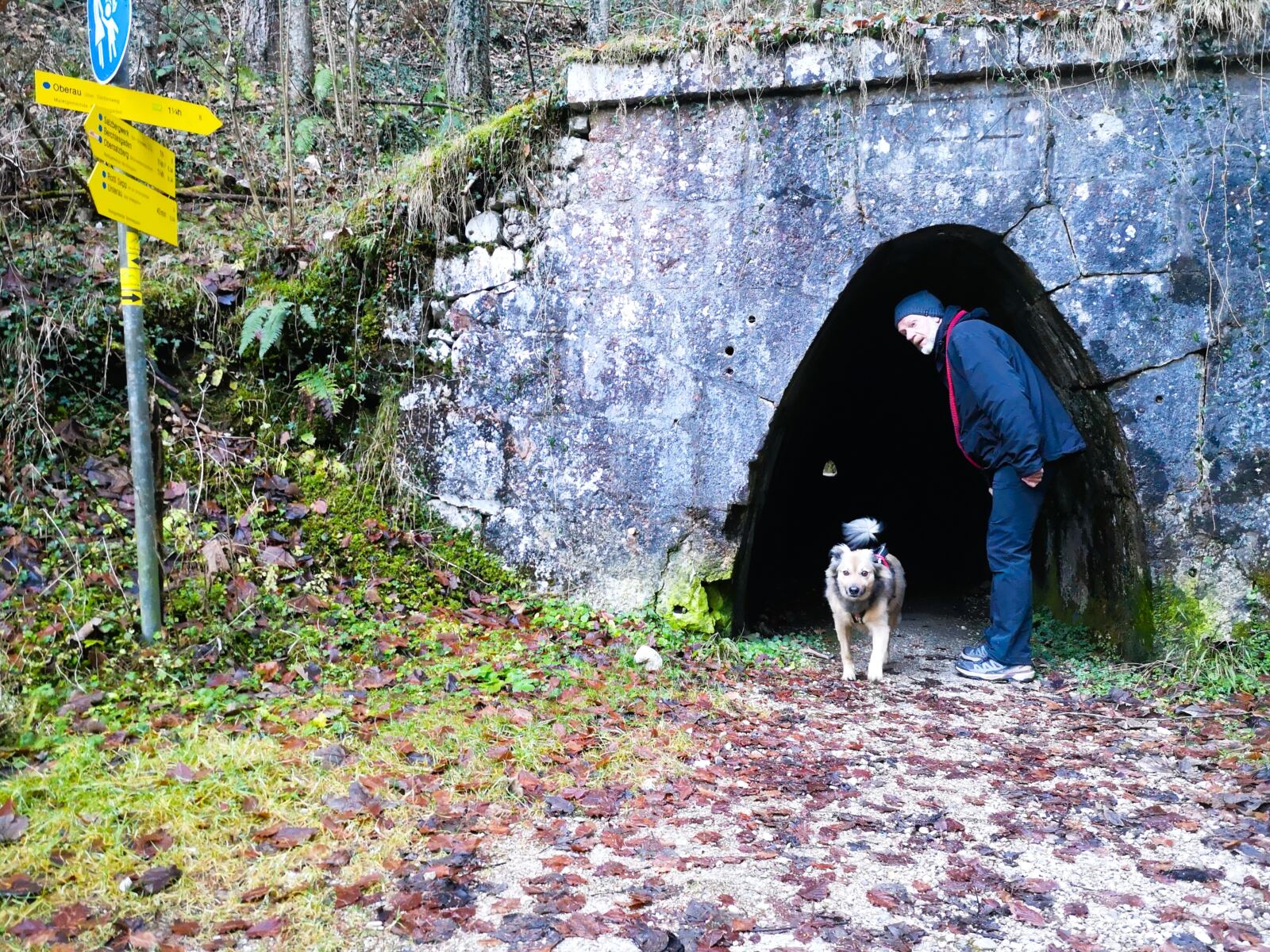 Der Forstweg läuft weitgehend eben durch lichten Wald. Wir folgen dem Wegweiser „Oberau über Stollenweg“ und erreichen bald den ersten von zwei Tunneln. Dieser hier ist rund 150 m lang, komplett in Stein gemauert und wurde, wie die Inschrift besagt, zwischen 1844 und 1848 erbaut. Leider fehlt eine Infotafel, die uns mehr verraten könnte. Amos findet den Weg durch den dunklen Gang ziemlich spannend. 😃