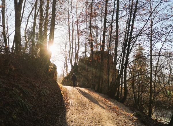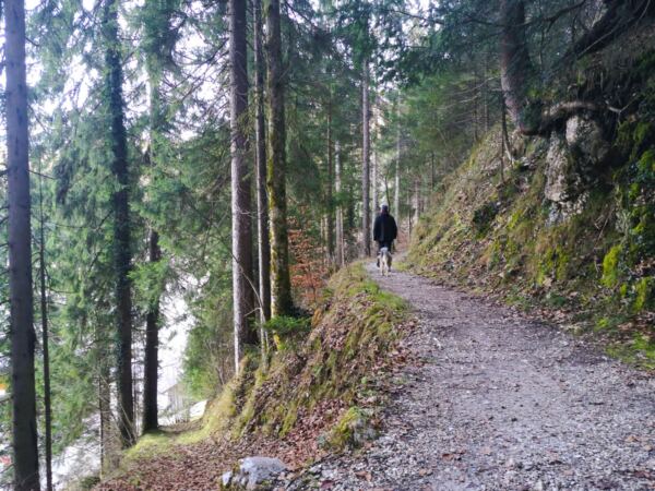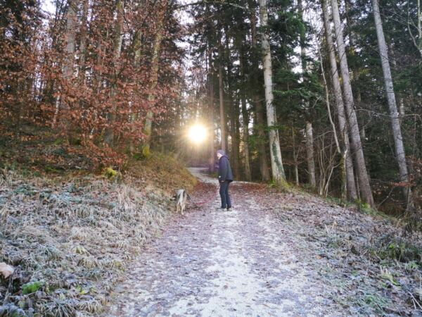 Wir starten von der obersten Terrasse des Campingplatz Allweglehen. Wir folgen dem Wegweiser „Zum Stollenweg“ 20 min stramm bergauf durch den Wald. Auf dem Stollenweg angekommen, biegen wir links ab. Damit laufen wir gegen den Uhrzeigersinn, in dem die Wanderung üblicherweise begangen wird. Für Menschen mit Hund ist so andersherum aber die bessere Variante, weil unser Vierbeiner vom Start an erst einmal lange durch Wald und Wiesen laufen kann.
