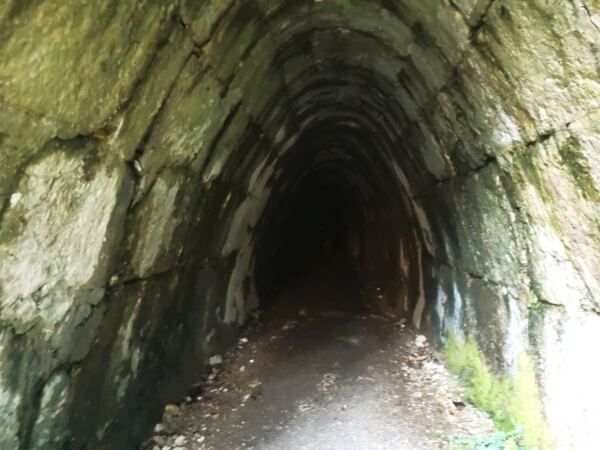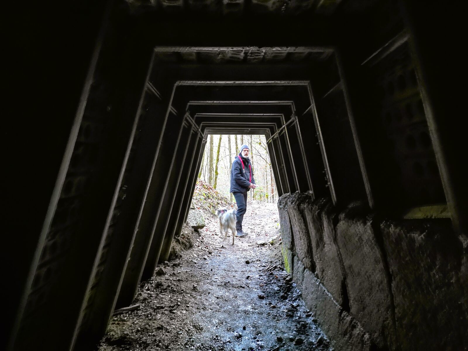 Wir erreichen den zweiten Stollen, der laut Jahreszahl im Stollenportal aus dem Jahr 1847 stammt. Leider fehlt auch hier eine Infotafel. Spaß macht’s trotzdem. 🔦 Wir traben durch den gut 200 Meter langen Tunnel, der mit Mauersteinen beginnt und mit Stahlträgern endet. Alles im allem ein sehr solider Bau. Und selbst unser über 1,90 Meter-Mann muss seinen Kopf nicht einziehen.