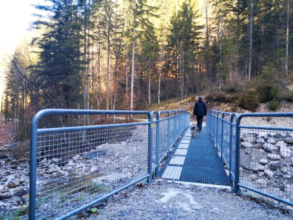 Der Stollenweg führt uns bergab durch den Wald in den Thalgraben. Eine Eisenbrücke (die der Hund auch locker umgehen könnte) bringt uns über den Larosbach. Der Stollenweg bringt uns durch den Wald, auf dem Obersalzberg bergan. Wir erreichen offenes Gelände mit herrlichem Talblick. Wir kreuzen die Zufahrt zur Obersalzbergsstraße. Oberhalb des Milchviehbetriebs und Ferienhofs Bernegglehen biegen wir scharf links ab auf den ausgeschilderten Wiesenpfad Richtung Oberau. Zwischen Schuppen und Stallgebäuden laufen wir bergab. Am Zaun nehmen neugierige Esel Aufstellung. 💕 Sie hoffen wohl auf ein Leckerchen.