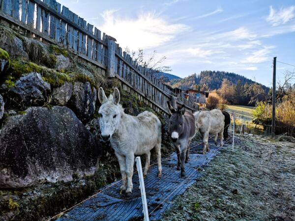 Die schnuckeligen Esel am Ferienhof Bernegglehen begleiten uns ein Stück des Wegs.