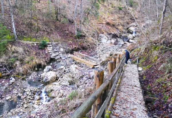 Der schöne Pfad führt uns über die Wiese Richtung Wald. Wir steigen bergab in den wilden Lettengraben, den wir über eine rohe Holzbrücke überqueren.