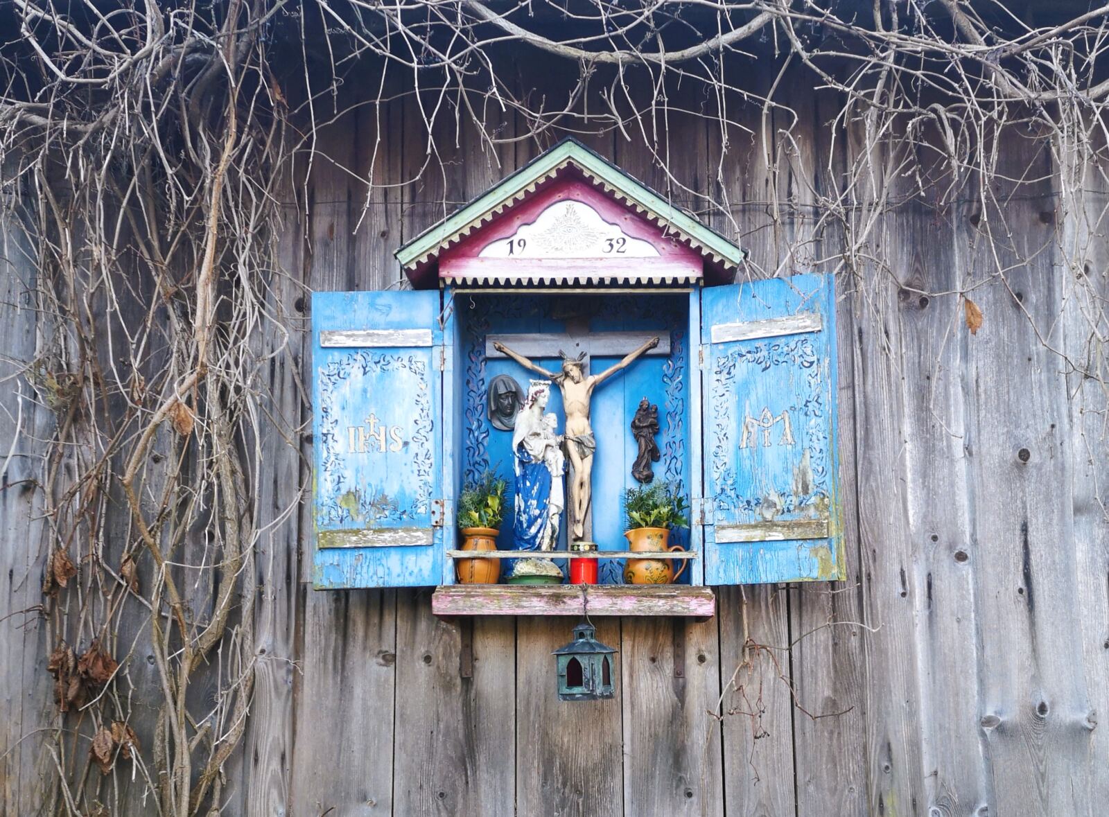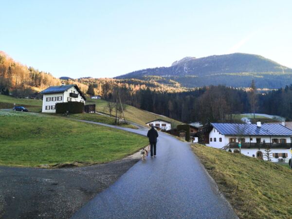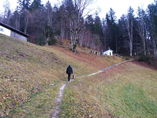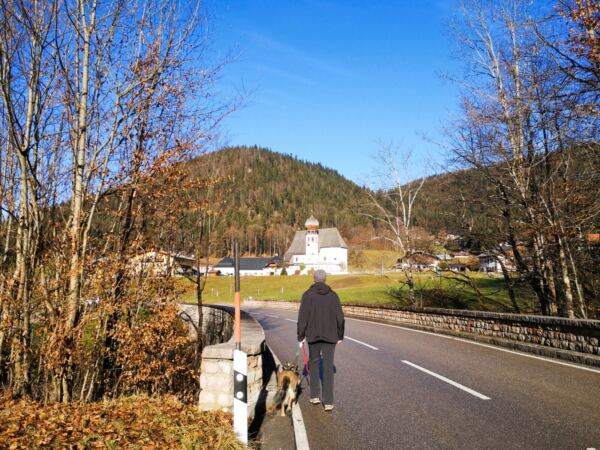 Unser Pfad mündet auf die Obersalzbergstraße. Wir folgen ihr bergab, unser Hund nun eng an der Leine, laufen Richtung Kirche in Oberau, überqueren den Kainbach und halten uns links. Bei nächster Gelegenheit überqueren wir die breite und befahrene Roßfeldstraße. Unterhalb der Pfarrkirche Heilige Familie mit ihrem gedrungenen Zwiebelturm biegen wir links ab auf den Lindenweg. Er dreht bald nach rechts, führt uns an der Kapelle Heilige Familie vorbei.