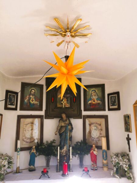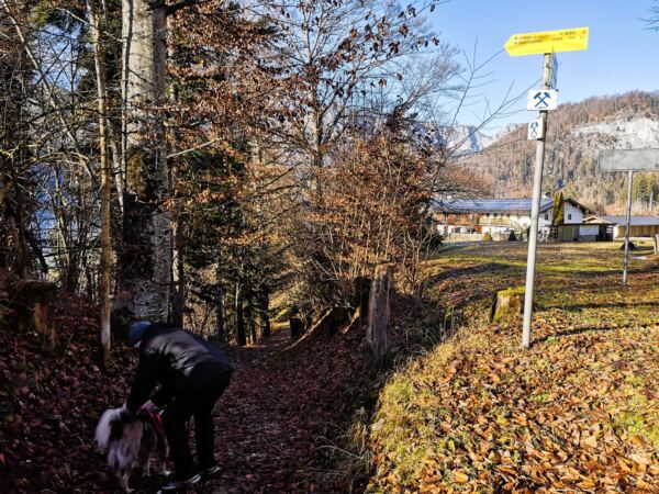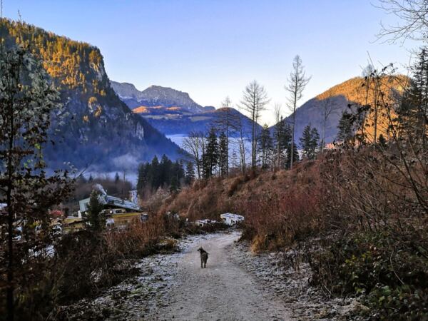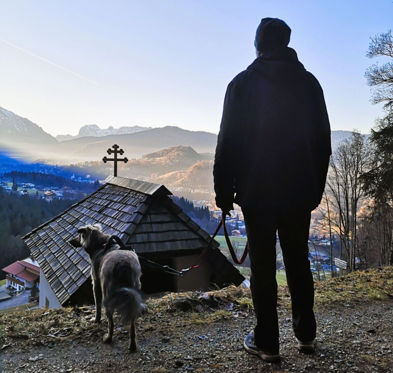 Schließlich stehen wir kurz vor dem Salzbergwerk. Hunde haben zu Museum und Shop keinen Zutritt. Im Restaurant-Café sind sie jedoch auch im Innenraum willkommen. Wer wie wir einen Abstecher machen möchte, folgt weiter der Bergwerksstraße. Dann geht es auf demselben Weg wieder zurück. Bei erster Gelegenheit biegen wir von der Bergwerksstraße rechts ab. Über Tanzebengasse und Mieslötzweg steigen wir steil den Berg hinauf. Von der Straße biegt unser Wanderweg über einem großen Anwesen mit Pool links in die Wiese ab. Wir laufen hinauf zur schönen alten Kapelle (die vielleicht Mausbichlkapelle heißt 🤔). Von hier aus gönnen wir uns noch einen langen Blick auf die Berchtesgadener Bergwelt bei Sonnenuntergang. Wir halten uns links, folgen der Beschilderung Stollenweg. Mit schönem Tiefblick wandern wir auf dem Stollenweg bis zur Kreuzung, an dem unser Zubringer zum Campingplatz Allweglehen abbiegt, den wir schon vom Hinweg kennen.