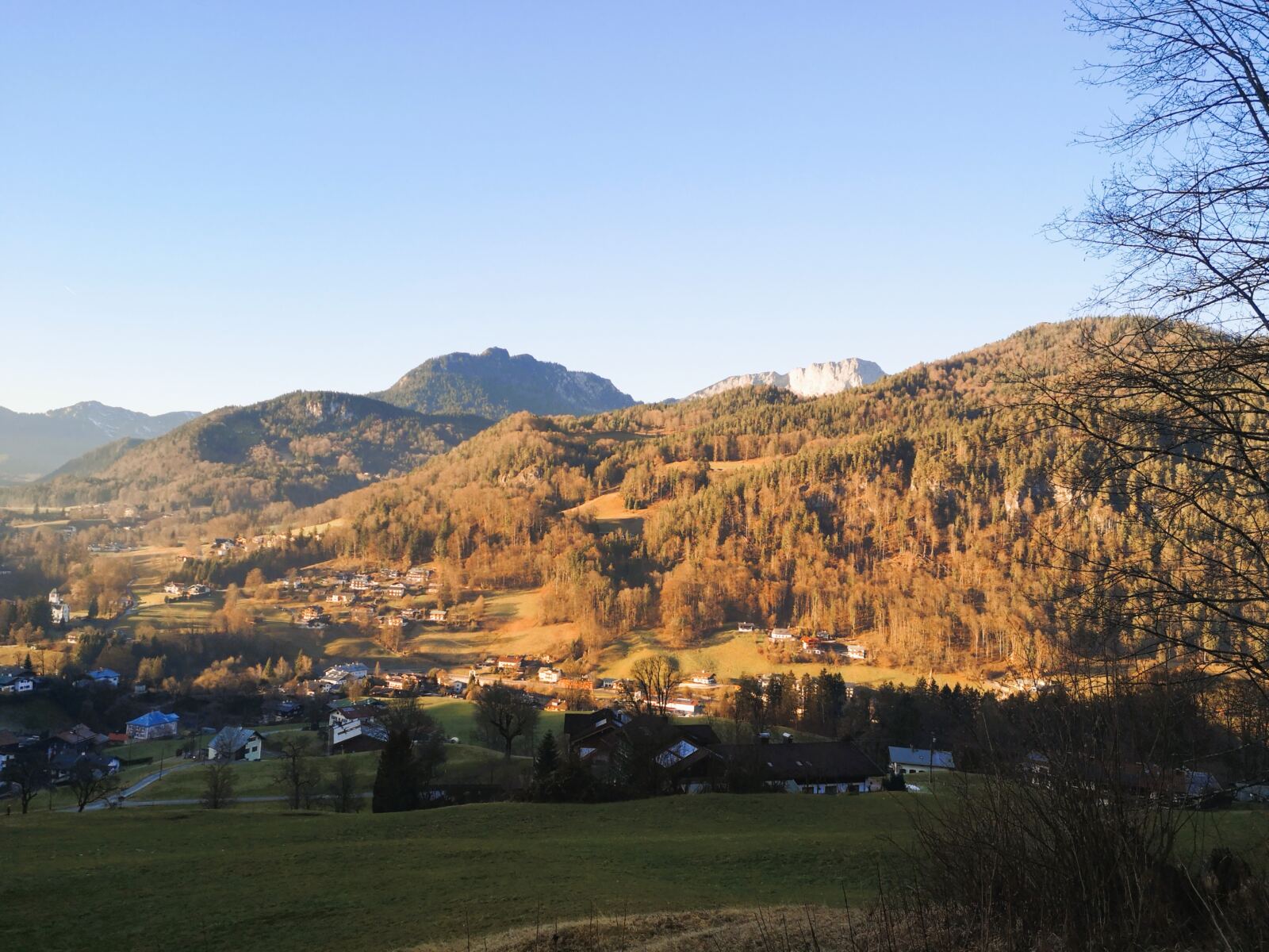 Weiter geht es auf dem Stollenweg durch den Wald, schließlich über freies Gelände mit schönem Tiefblick auf den Salzburger Hausberg, den Untersberg.