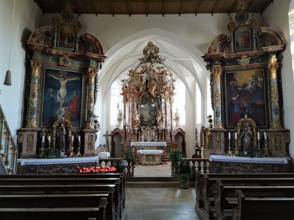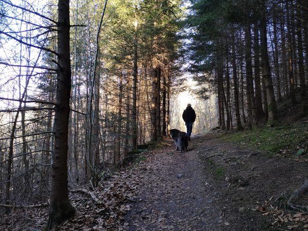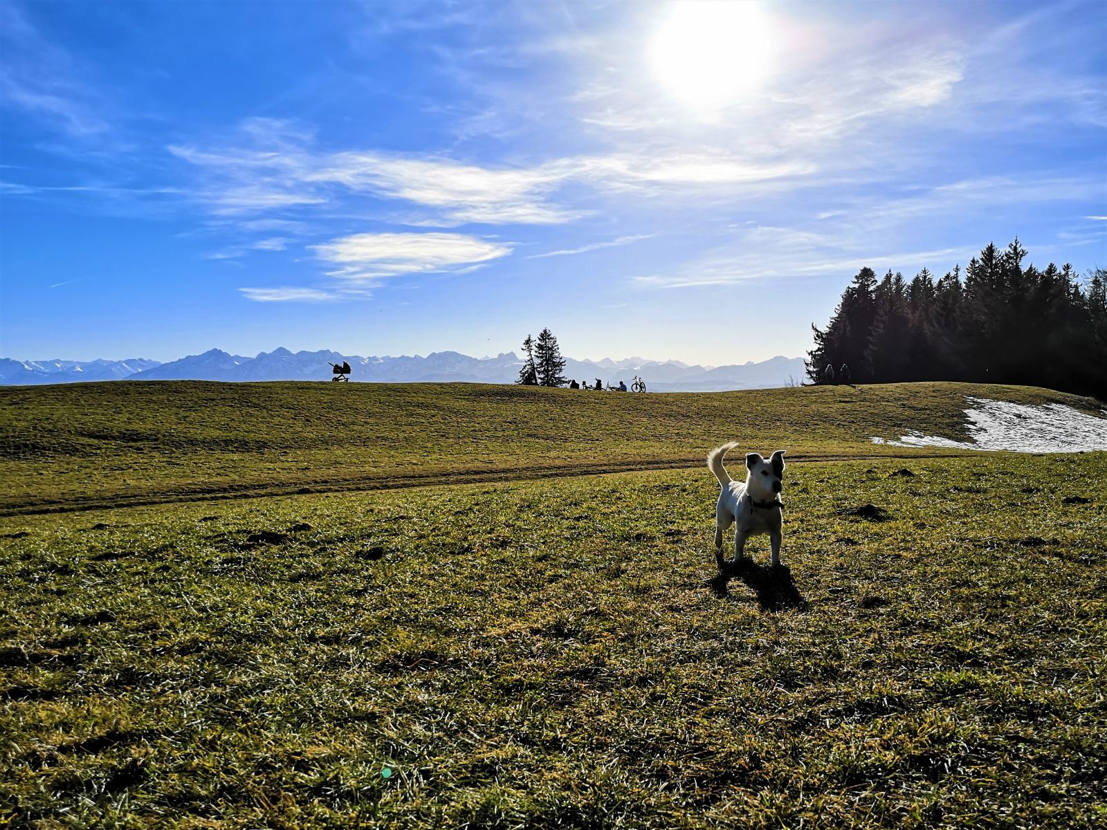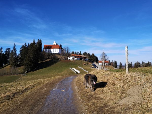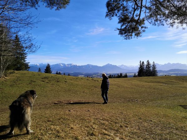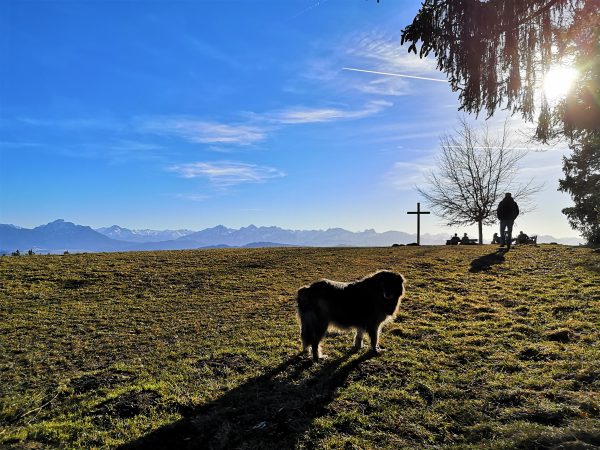 Auf der Grenze zwischen Oberbayern und Schwaben reckt sich der Auerberg, auch Schwäbische Rigi genannt, gut 1.000 Meter in die Höhe. Die Aussichtskanzel mit Gaststätte, wenigen Häusern und der Kirche St. Georg ist bei Radlern, Bikern, Reitern, Spaziergängern mit und ohne Hund sehr beliebt. Kein Wunder, denn der Blick von hier oben ist gewaltig. Er reicht vom Westen über den Bregenzer Wald und die Allgäuer Alpen mit dem Forggensee über Ammergauer Alpen, Wettersteingebirge und Wendelstein im Osten. Schon die Römer schätzten diesen Ort, Reste ihrer Siedlungswälle sind noch zu sehen. Zahlreiche hundepfotenweiche Wege, dazwischen geteerte Passagen, führen zum Berg hinauf und um ihn herum. Diese kleine Runde mit altem Wauzi lässt sich also problemlos verlängern. Viel Sonne, wenig Schatten. Mit Vierbeiner am schönsten an einem klaren Tag außerhalb der (Weide- und Touristen-)Saison.