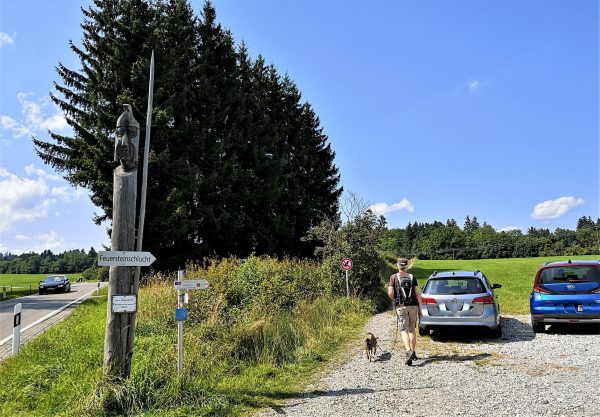 Am Ausgangspunkt unserer Tour. Der Wanderparkplatz liegt gegenüber auf der anderen Straßenseite am Wald.
