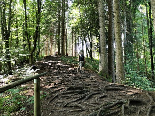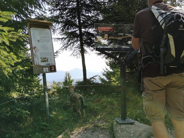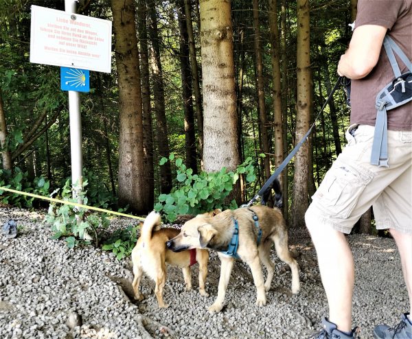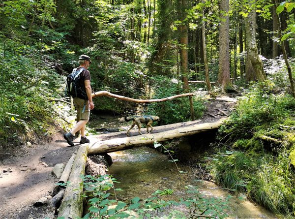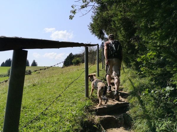 Unter Füßen und Pfoten: Wald-, Wiesen- und Wurzelpfade, dazwischen wenig Teer und Schotter. In der Feuersteinschlucht müssen einige wenige Gittertreppen bewältigt werden. Wir haben unseren Kleinen hier getragen. In der Schlucht und auf dem Jägersteig entlang der Weiden gilt Leinenpflicht, angesichts so viel Schönheit aber locker zu verkraften. Natürlich am schönsten an einem klaren Tag.
