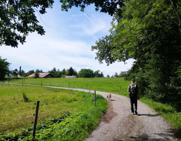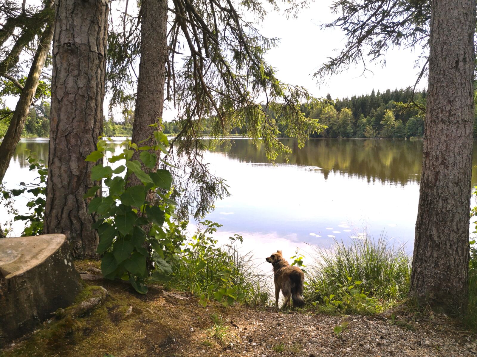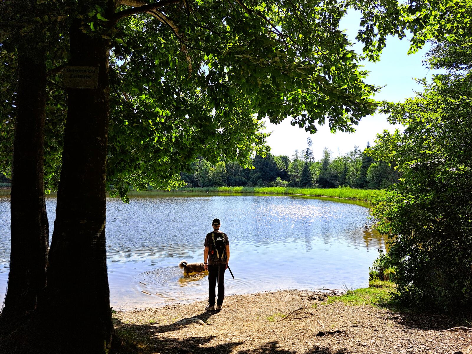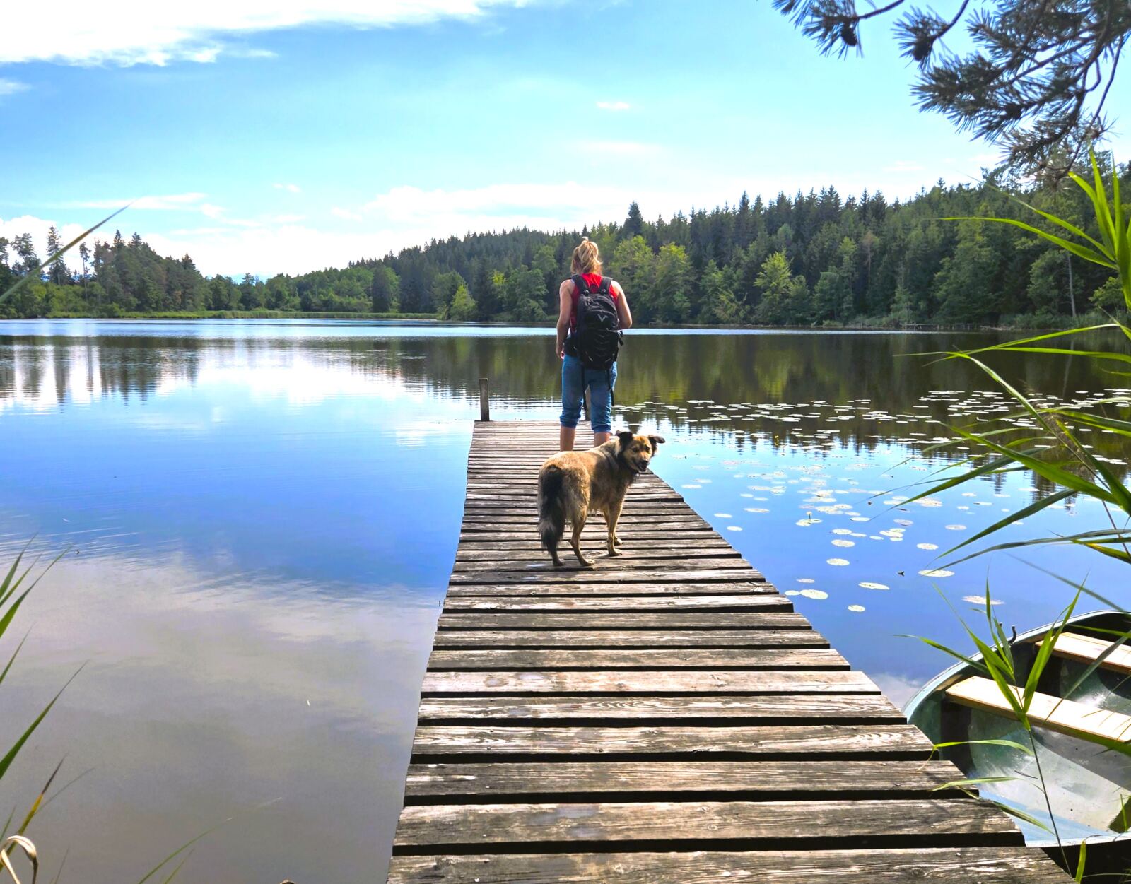 An warmen Sommertagen gehört diese Runde zu unseren Lieblingswanderungen mit Hund am Starnberger See. Der Klosterweiherweg bei Bernried führt uns durch die typische Moränenlandschaft der Region, geprägt von sanften Hügeln, den so genannten Drumlingfeldern, ruhigen Wäldern und Feuchtwiesen mit Wildblumen und Wasserläufen. Die Seen – Höhepunkte der Wanderung – reihen sich auf der Strecke aneinander wie Perlen an einer Schnur. Auf den kleinen Hausstatter Weiher folgt der idyllische Auweiher mit seinem Steeg, der noch größere Gallaweiher mit seiner breiten Bucht und schließlich der schilfbestandene Neusee. Unterwegs findet unser Hund immer wieder Zugänge zum Wasser. Und wir nutzen die vielen schönen Picknickplätze, zum Beispiel am Auweiher. Wir sehen den Libellen zu, die über Seerosen flitzen, genießen die Sonne, die sich im grünen Wasser spiegelt, und vergessen die Zeit.
