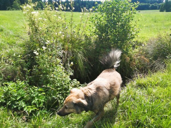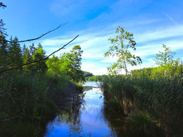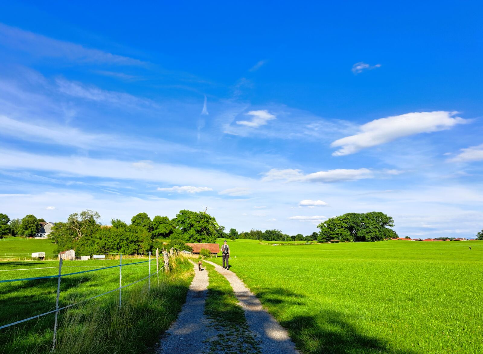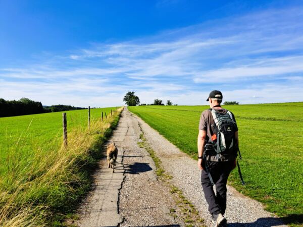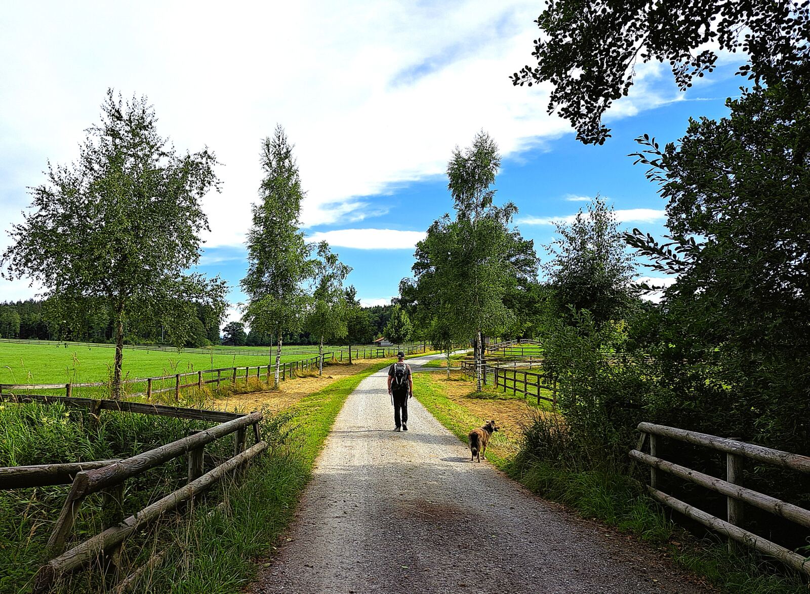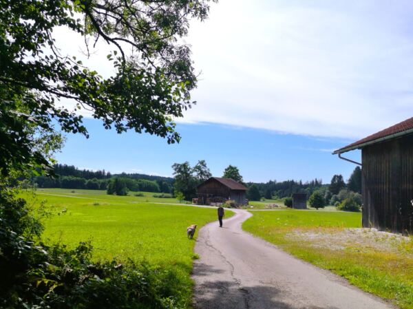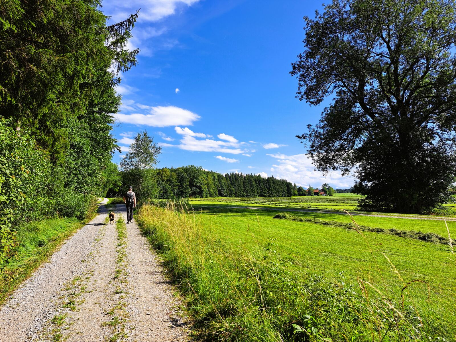 An warmen Sommertagen gehört diese Runde zu unseren Lieblingswanderungen mit Hund am Starnberger See. Der Klosterweiherweg bei Bernried führt uns durch die typische Moränenlandschaft der Region, geprägt von sanften Hügeln, den so genannten Drumlingfeldern, ruhigen Wäldern und Feuchtwiesen mit Wildblumen und Wasserläufen. Die Seen – Höhepunkte der Wanderung – reihen sich auf der Strecke aneinander wie Perlen an einer Schnur. Auf den kleinen Hausstatter Weiher folgt der idyllische Auweiher mit seinem Steeg, der noch größere Gallaweiher mit seiner breiten Bucht und schließlich der schilfbestandene Neusee. Unterwegs findet unser Hund immer wieder Zugänge zum Wasser. Und wir nutzen die vielen schönen Picknickplätze, zum Beispiel am Auweiher. Wir sehen den Libellen zu, die über Seerosen flitzen, genießen die Sonne, die sich im grünen Wasser spiegelt, und vergessen die Zeit.