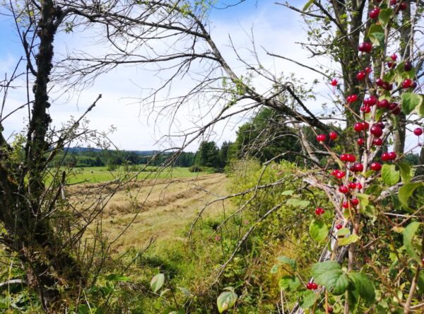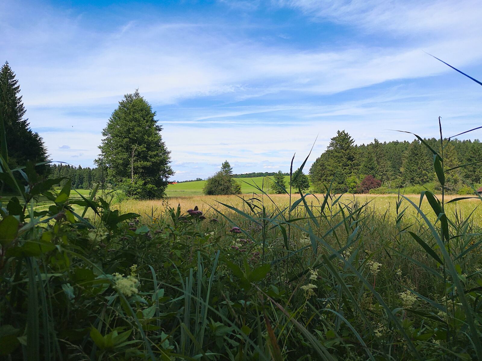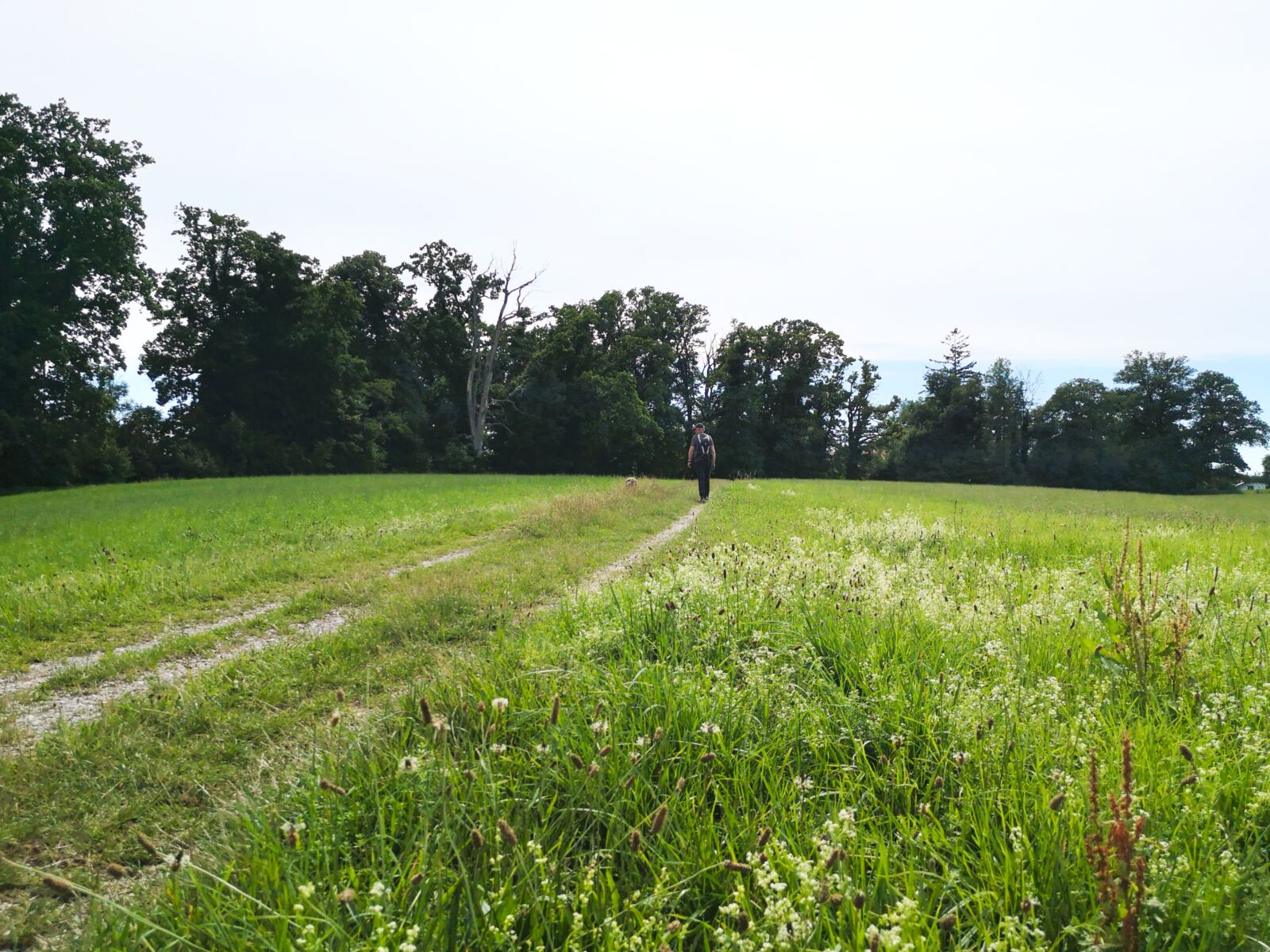 Wenige Meter hinter unserem Parkplatz laufen wir bergauf zwischen Wiesen - und tauchen ein in die Stille,