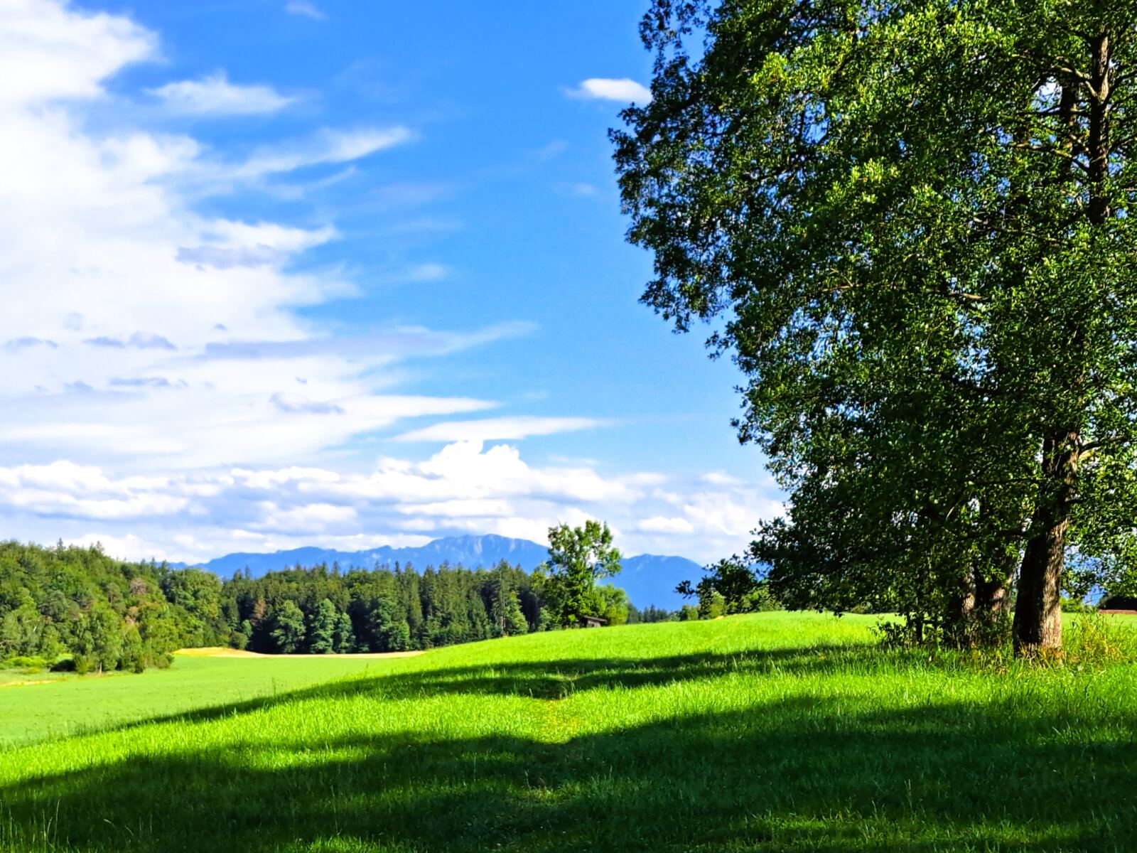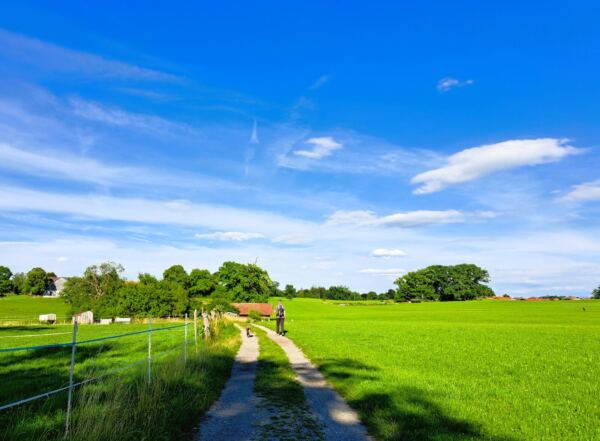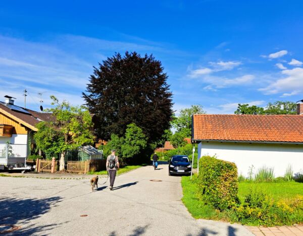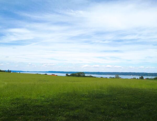 Den See im Rücken, laufen wir auf dem schmalen Wanderpfad zwischen Wiesenflächen bergauf. Rasch gewinnen wir an Höhe. Der Blick zurück bietet uns eine schöne Aussicht auf den Starnberger See. Am Ende des Pfads halten wir uns rechts, unserem Wegweiser mit den beiden Fischen folgend. Zwischen Häusern auf der linken Seite und Weiden auf der rechten Seite geht es geradeaus.