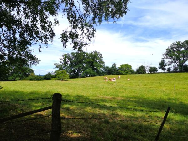 Wir folgen den Wegweisern weiter geradeaus durch den Wald, biegen links auf einen Pfad ab und unterqueren eine Bahntrasse. Wir gehen weiter auf dem Weg parallel zum Röthelbach, biegen dann scharf links ab. Über einen schnurgerade Allee laufen wir an Viehweiden und Koppeln vorbei. Hinter der Allee führt unser Weg scharf rechts ab und bergauf. Zwischen Wald und Weiden gehts weiter geradeaus.