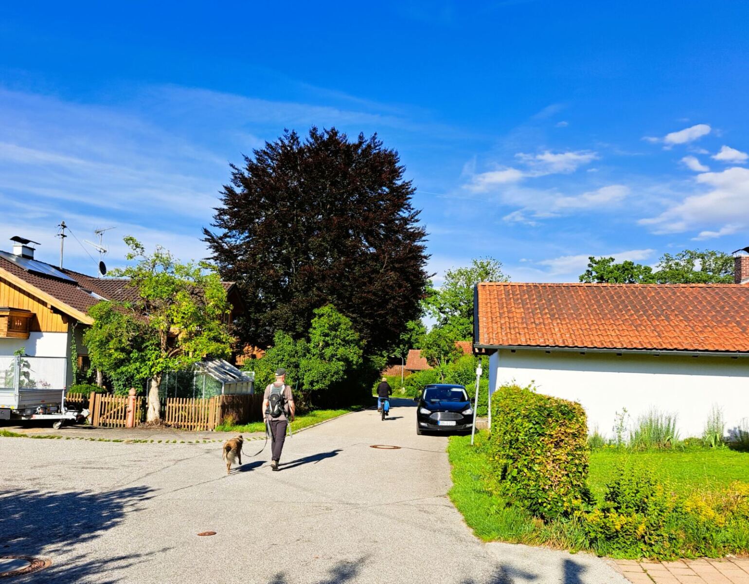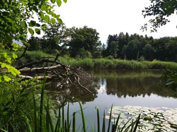 Bald führt uns der Weg in den Wald hinein, vorbei am kleinen, dicht bewachsenen Hausstatter Weiher. Dieser bietet unserem Hund aber zwei Zugänge, über die er bequem in den Teich kommt. Weiter geht es. Wir folgen dem Höhenrieder Weg um den Weiher herum. Der Weg führt uns durch ein schönes Waldstück. Aus dem Wald heraus mündet unser Weg auf ein Teersträßlein. Wir halten uns links.