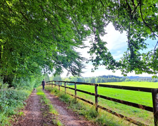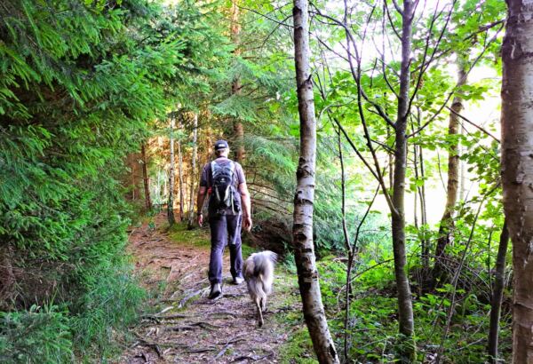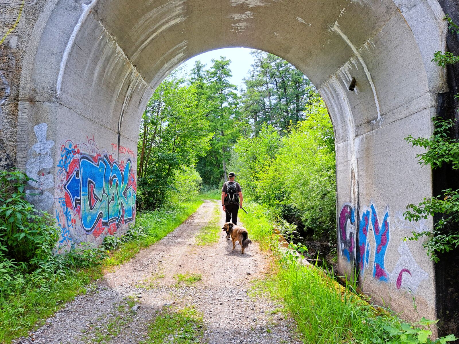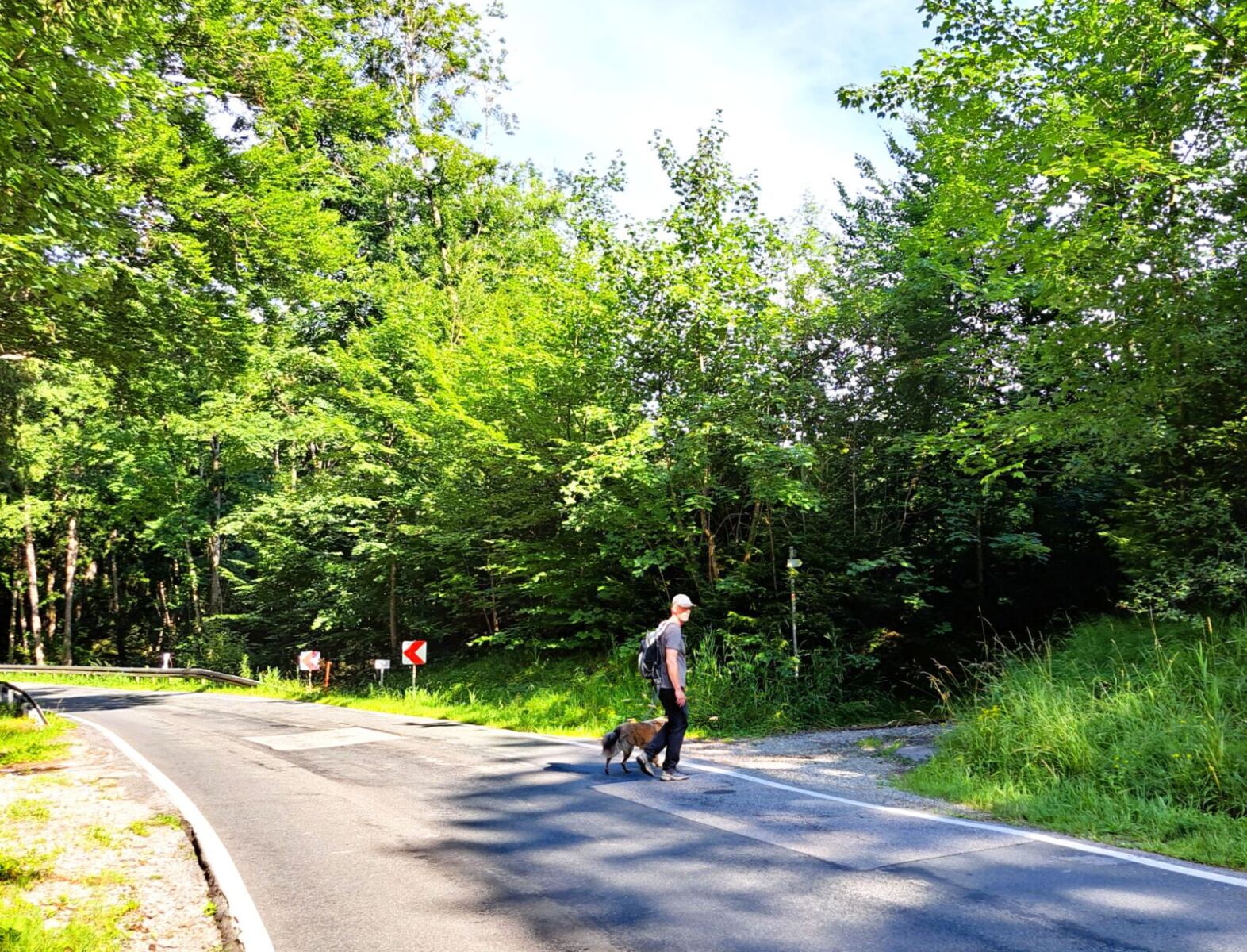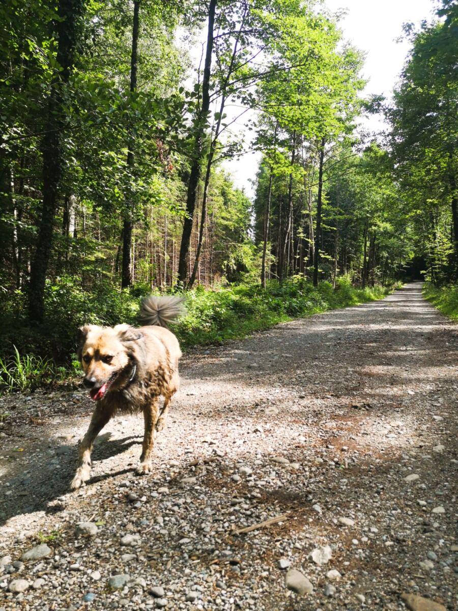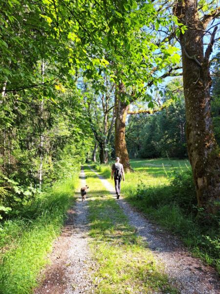 🥾🐾 Auch unter Füßen und Pfoten gibt es viel Abwechslung. Der Untergrund ist ein bunter Mix aus schmalen Wiesenpfaden, wurzeligen Waldwegen und Forstwegen, dazu kurze Abschnitte auf ruhigen Teersträßchen. Schatten überwiegt, auch deshalb ideal an sehr warmen Tagen. Kaum Steigungen. Es geht weitgehend eben und anstrengungslos dahin.
