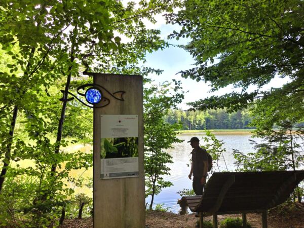 Am Gallaweiher. Hier findet sich das Wandersymbol auch als kleines Kunstwerk wieder, ebenso am Auweiher. Sehr schön gemacht.