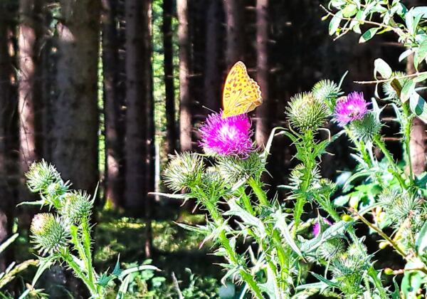 Durch moorige, Blumen-bestandene Wiesen mit Wasserläufen folgen wir dem Sträßchen, das schließlich in einen geschotterten Wirtschaftsweg übergeht und wieder in den Wald eintaucht. Den Wegweiser folgend erreichen wir schließlich den großen, idyllischen Auweiher. Lange bleiben wir auf der Wellenbank am Weiher sitzen und lassen den Blick über die Seerosen hinüber zum anderen Ufer fliegen. Dann geht es weiter.