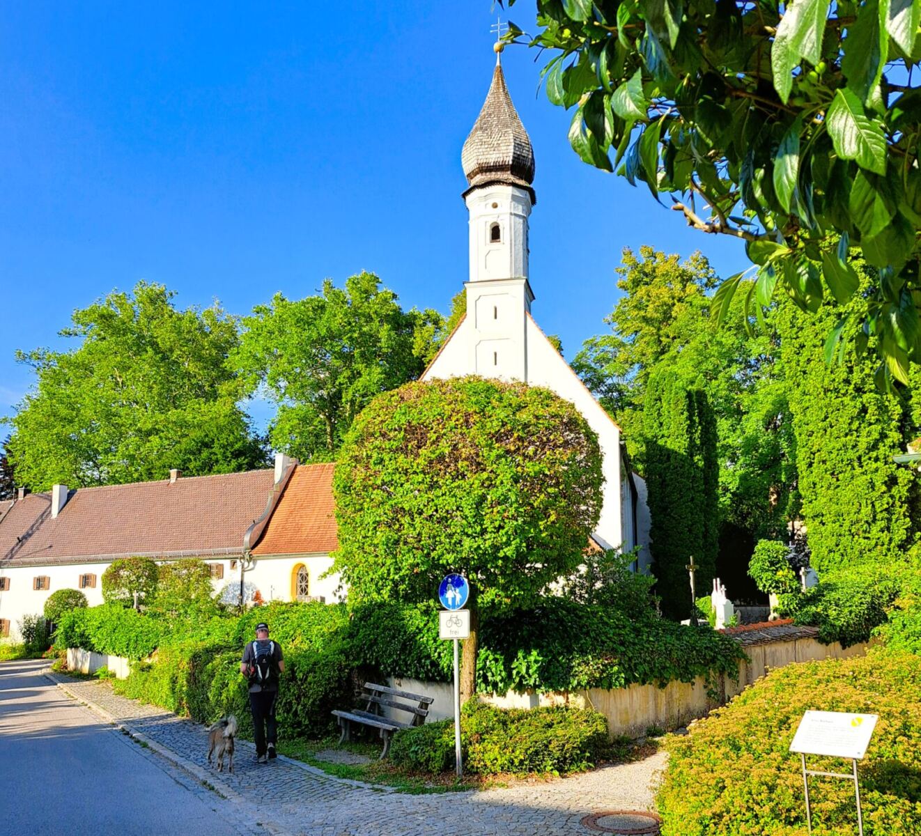 Wir erreichen den Gallaweiher, durch ein Wehr zweigeteilt. Auf einem schönen Wanderweg laufen wir am Weiher entlang. Bald erreichen wir hier eine Bucht, in der unser Amos wieder abtaucht. Weiter geht es im großen Bogen zwischen Wald und Weiher. Wir kreuzen die Bundesstraße. Vorsicht beim Überqueren! Auf gut beschilderten Forstwegen erreichen wir schließlich das südliche Ende des Neusees mit dichten Schilfgürtel. Über lichte Wirtschaftswege, vorbei an einem Pferdehof gelangen wir in den Ortsteil Hapberg. Wir laufen vorbei am Sportgelände und einem Gewerbegebiet, überqueren die Bahnlinie und die Bundesstraße. Entlang des Busch-Woods-Stiftungsparks (angeleinte Hunde im Park erlaubt) und vorbei am Grundweiher kommen wir zum ehemaligen Augustiner Chorherrenstift mit seiner goldenen Zwiebel. Am Ufer des Starnberger Sees bummeln wir gemütlich zurück zu unserem Ausgangspunkt.