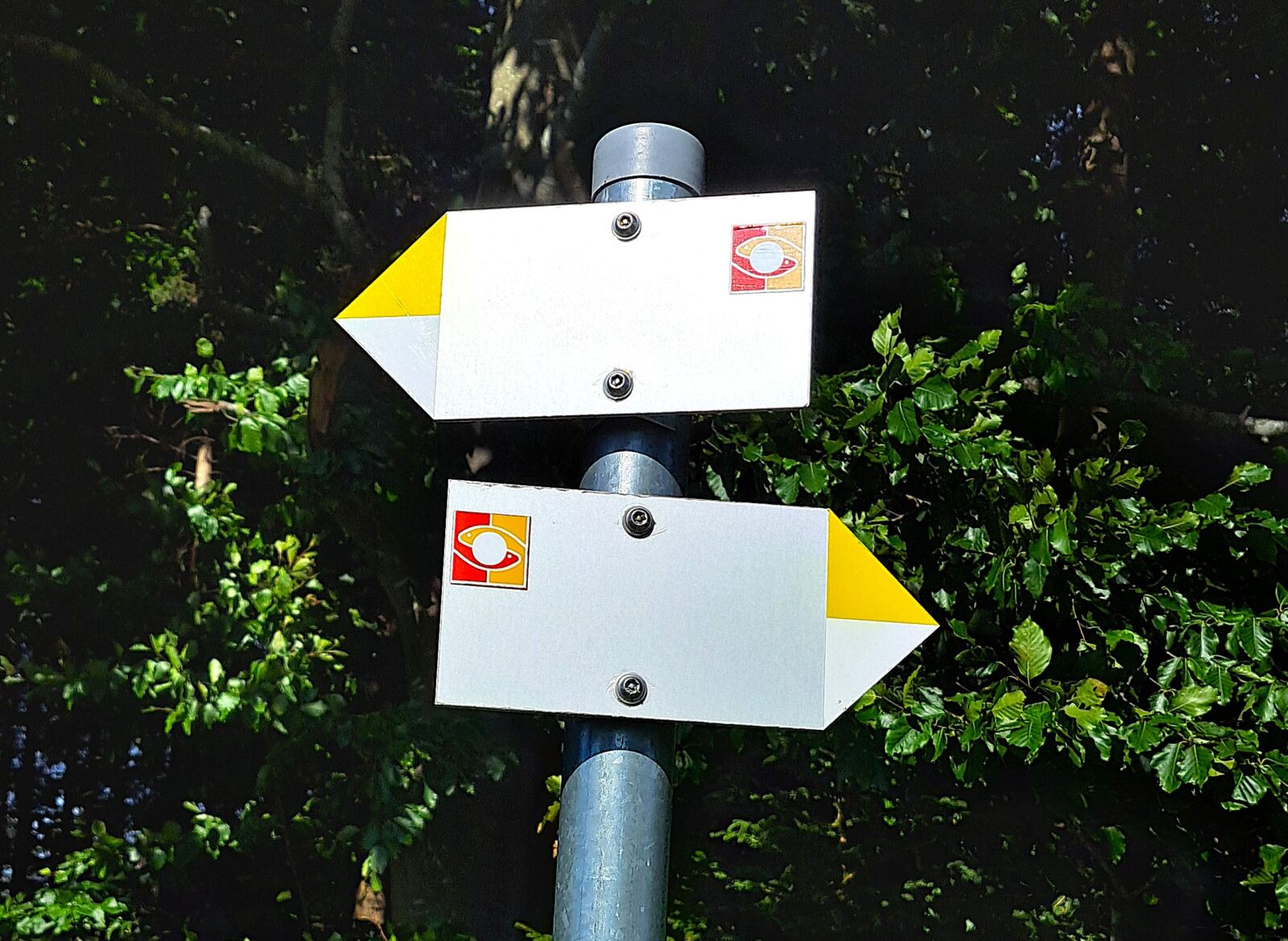Der Rundweg ist durchgehend gut beschildert. Nach dem Anstieg zum Start folgen wir stets den Wegweisern mit den beiden stilisierte Fischen, die sich um ein Auge schlingen.