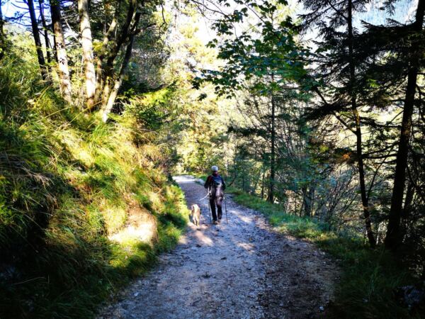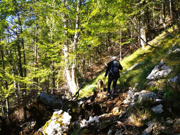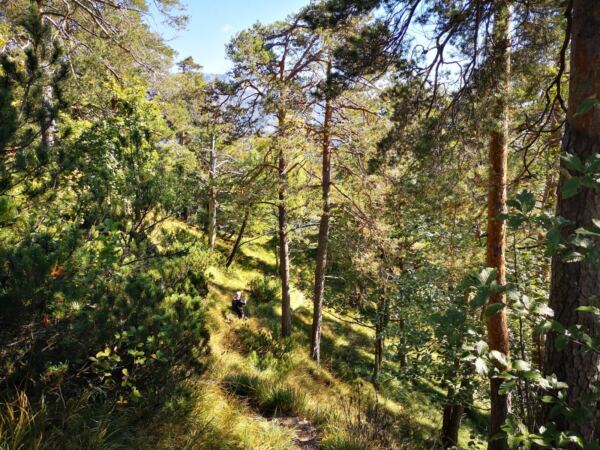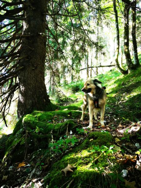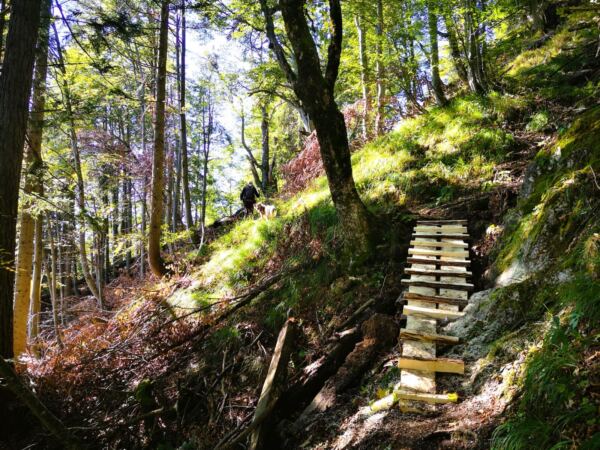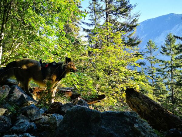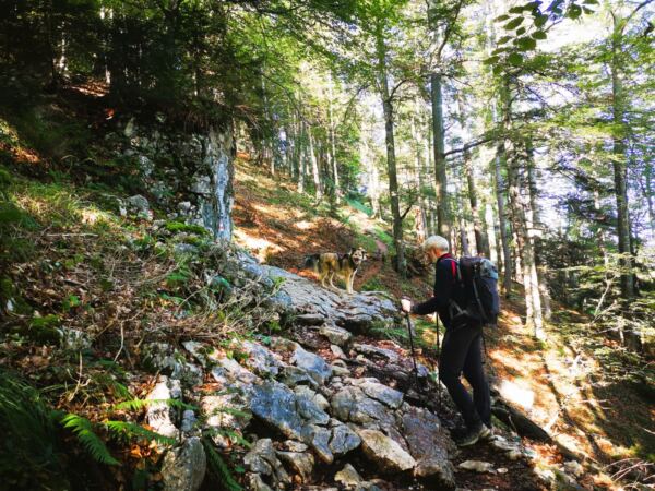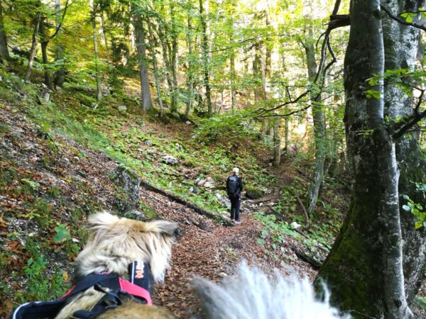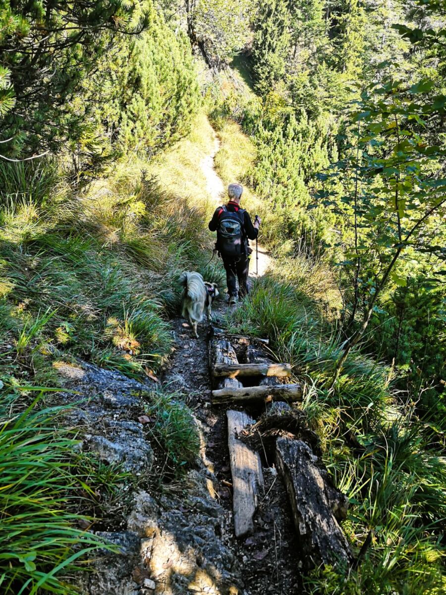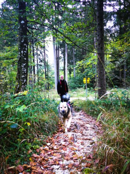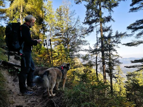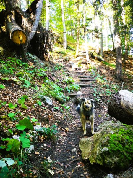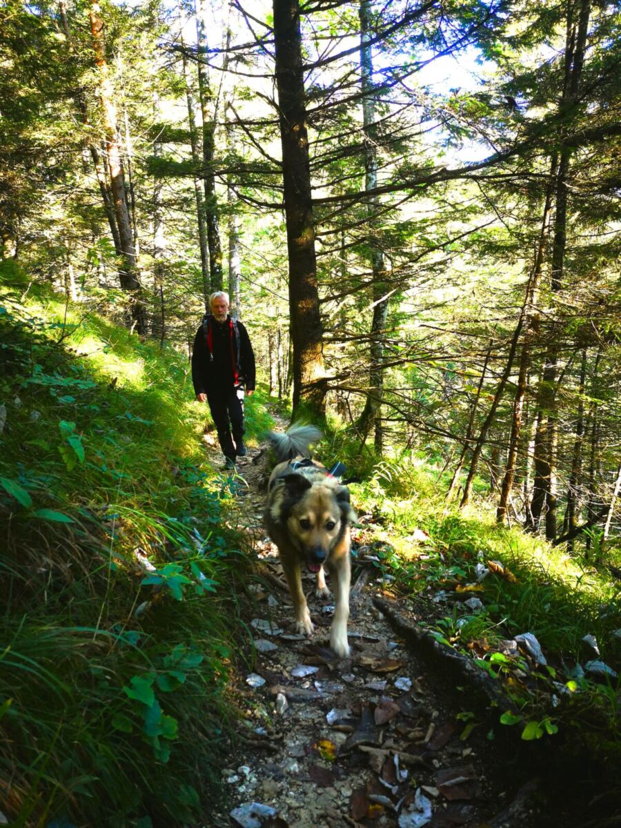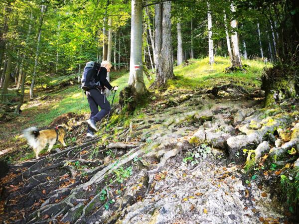 🥾🐾 Unter Füßen und Pfoten: fast durchgehend schmale, oft wurzelige, manchmal felsige Steige durch lichten Bergwald. Über kurze Abschnitte sind wir auf breiten befestigten Almwegen unterwegs.