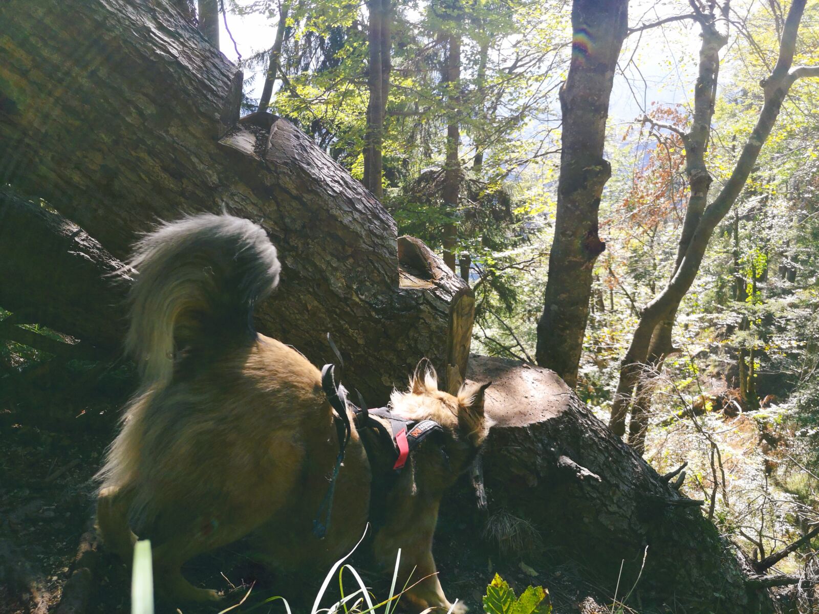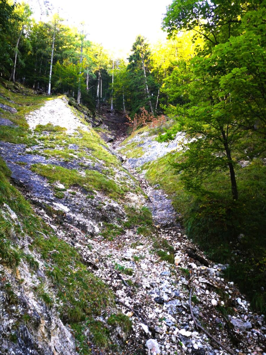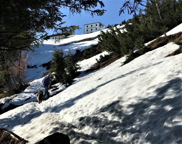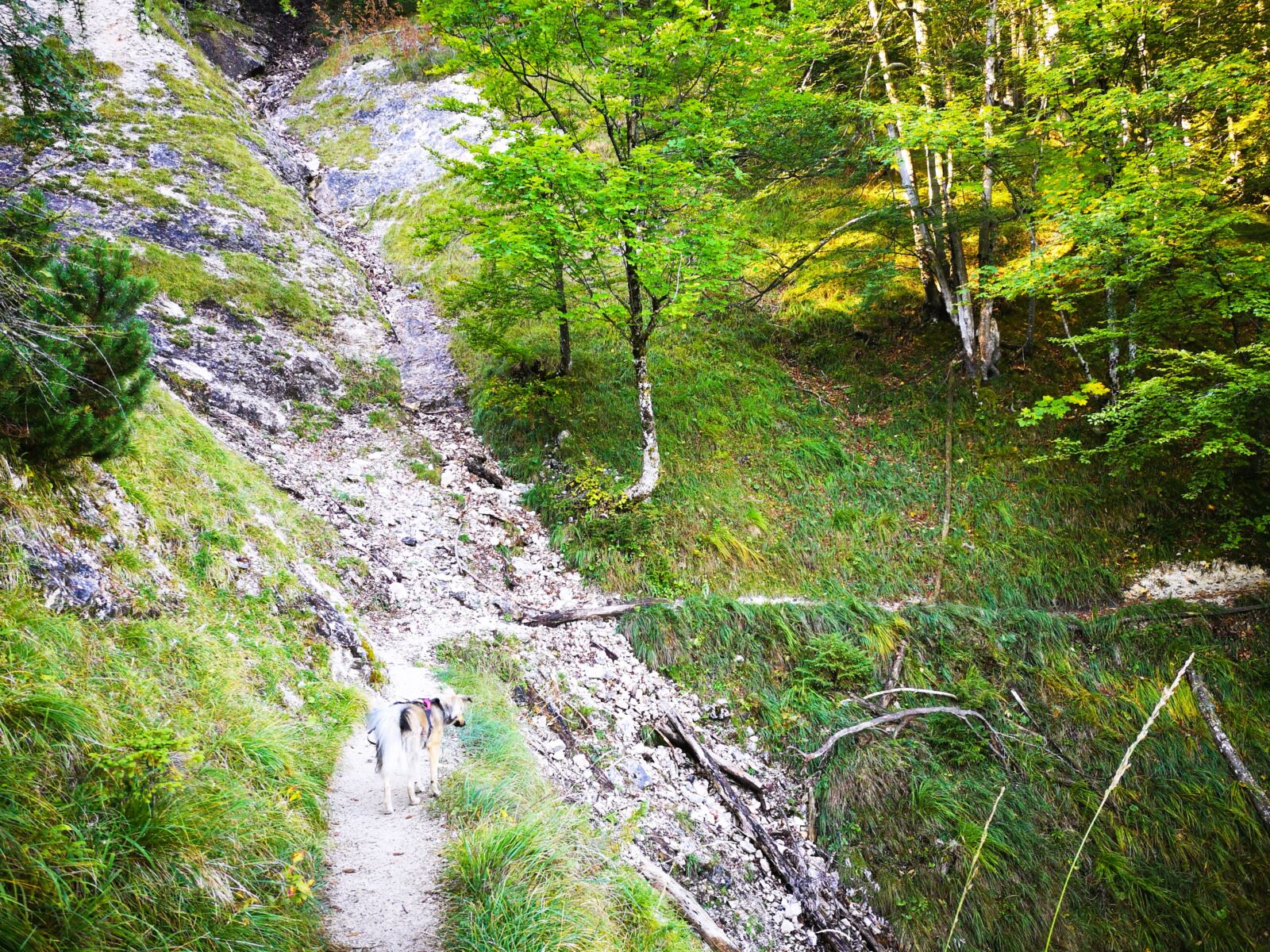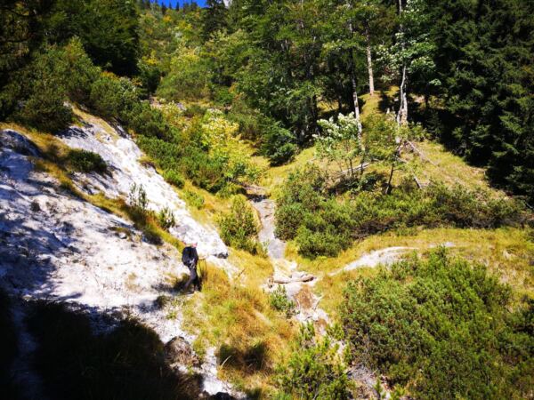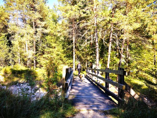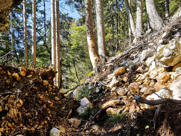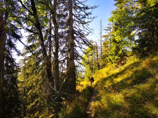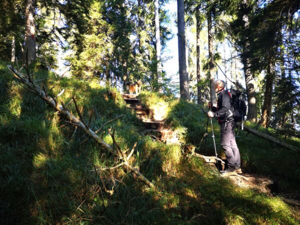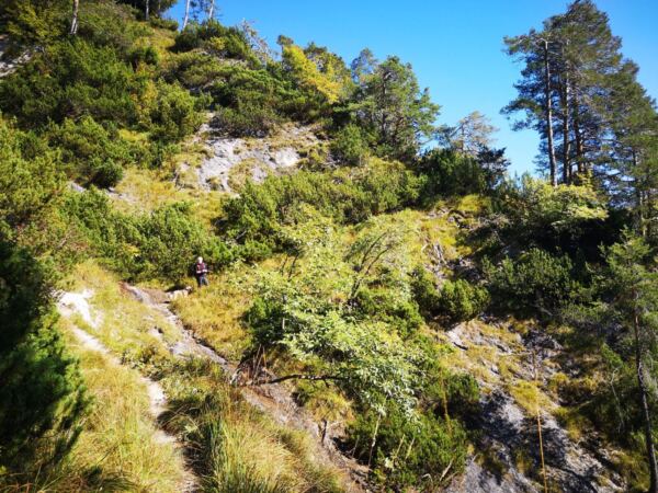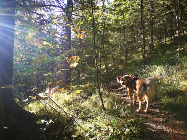 🥾🐾 Unter Füßen und Pfoten: fast durchgehend schmale, oft wurzelige, manchmal felsige Steige durch lichten Bergwald. Über kurze Abschnitte sind wir auf breiten befestigten Almwegen unterwegs.