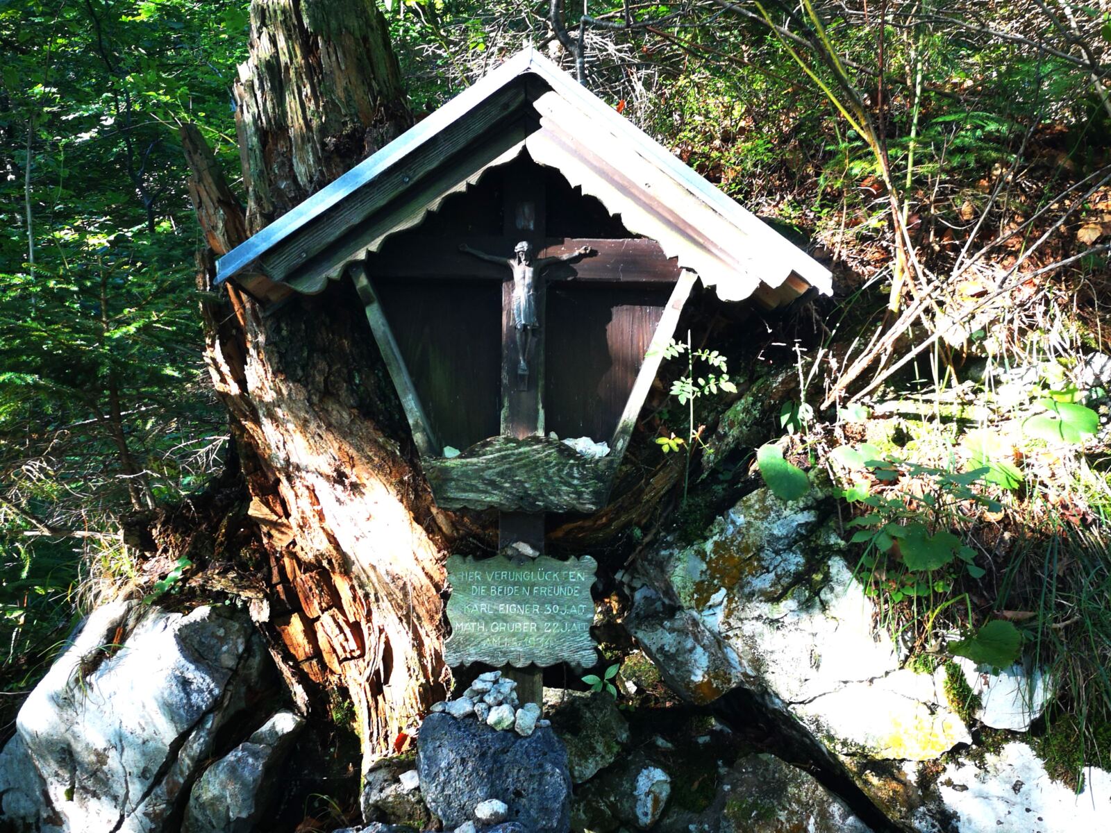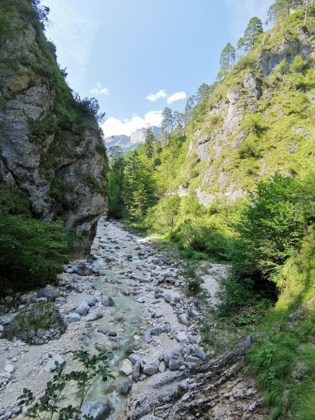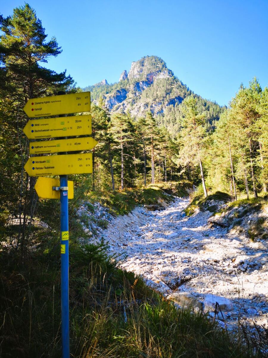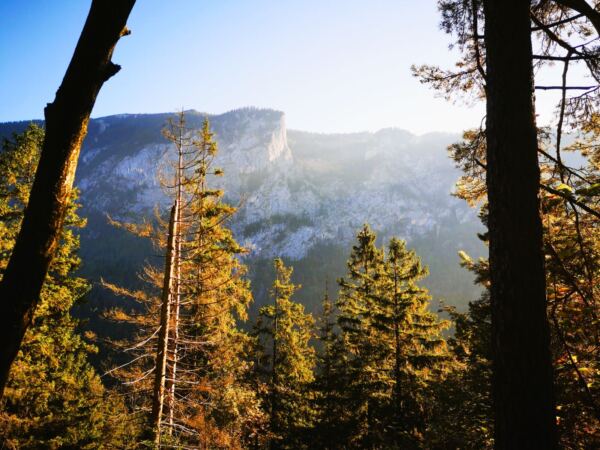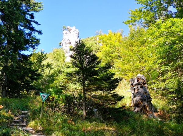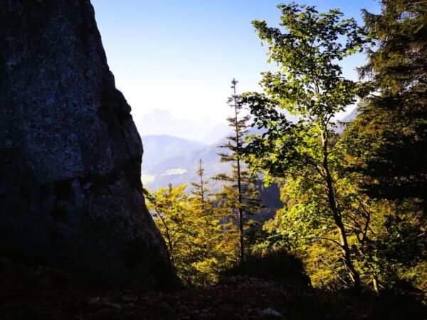 Vom Parkplatz aus folgen wir dem gut ausgeschilderten SalzAlpenSteig auf breitem Forstweg den Berg hinauf. Bald biegt rechts der ausgeschilderte Steig zur „Steinernen Agnes“ ab. Der Pfad führt uns in angenehmen Serpentinen durch schattigen Bergwald hinauf. Wir erreichen ein Marterl – Erinnerung an zwei junge Freunde, die hier verunglückten – mit Bank und Aussicht auf den Hochthron und hinunter ins Tal.