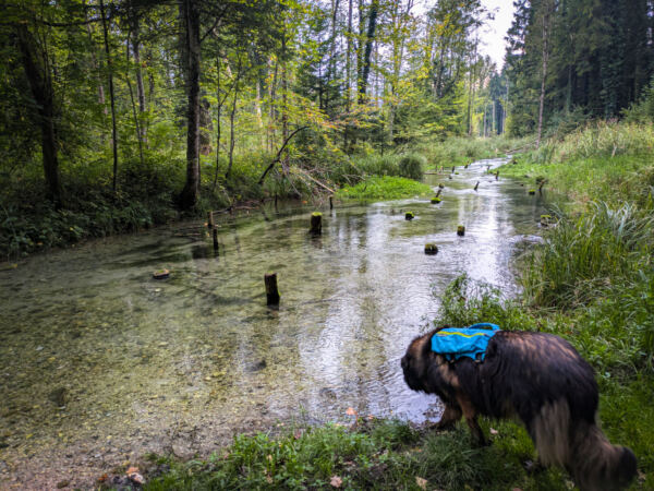💧Unterwegs kreuzen immer wieder kleine Wasserläufe unseren Weg. Weil’s zunächst aber recht steil bergauf geht, ausreichend Wasser auch für den Vierbeiner einpacken.