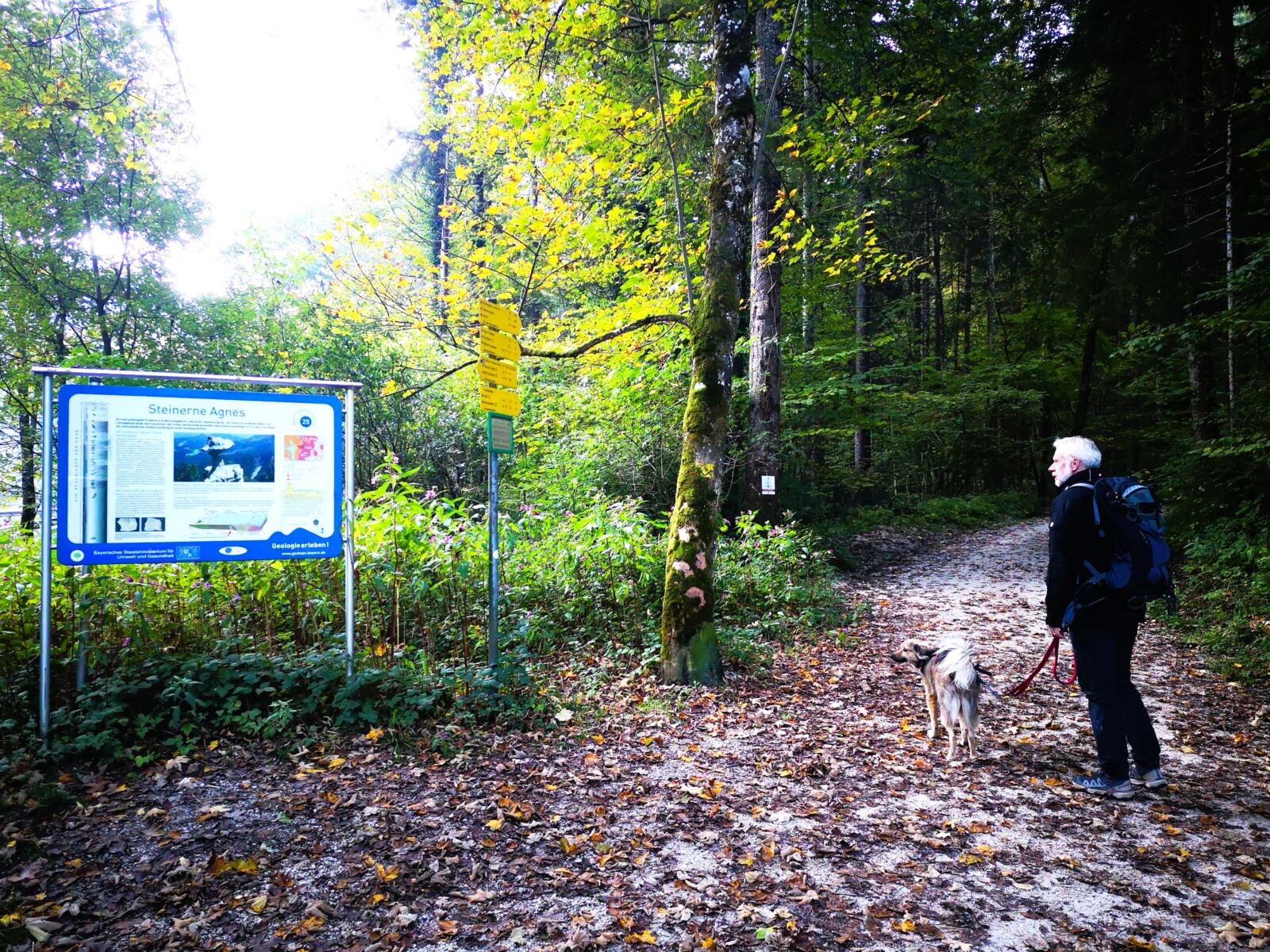 Schließlich erreichen wir den Standort der „Steinernen Agnes“ mit Bänken, Infotafel und herrlichem Weitblick auf Karkopf, Watzmann und Hochkalter. An diesem sonnigen Feiertag treffen wir auf zwei Handvoll Menschen – fast schon ein Auflauf nach der Einsamkeit des Wegs. 😊 Mit unserem Hund nun an der Leine steigen wir auf durch die sandig-rutschige Rinne hinauf zum Fuß der Agnes. Von dort aus sind es nur noch ein paar – noch rutschigere – Meter rechts von Agnes hinauf zum Aussichtspunkt über dem Kopf. Wer mit Vierbeiner nicht ganz nach oben will: schon nach kurzem Abstieg vom Fuß der Säule lässt sich Agnes ins Gesicht blicken.
