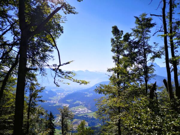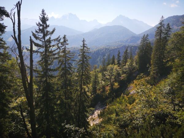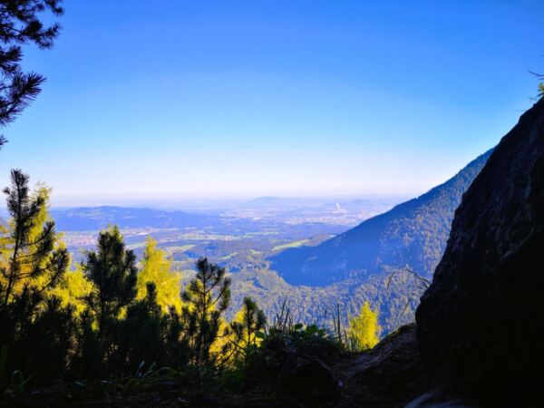 Weiter geht’s. Bis zur nächsten beschilderten Kreuzung folgen wir dem Weg, den wir gekommen sind. An der Kreuzung halten wir uns dann rechts Richtung Winkl und Hallthurm über Panoramaweg. Auf einem manchmal herrlich-abenteuerlichen Weg – er führt uns auch über Treppen, die in umgestürzte Bäume gesägt wurden – steigen wir über den Bichlberg mit großartigem Ausblick bergab nach Winkl.