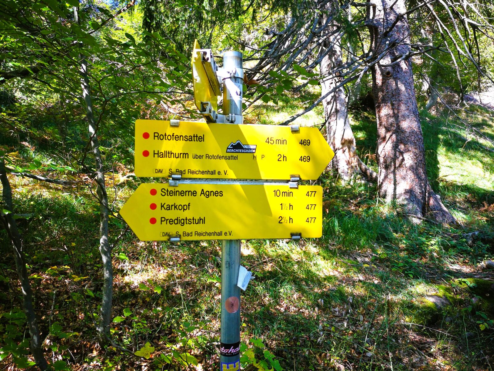 Über eine Treppe im Hang steigen wir weiter bergauf, folgen den Serpentinen. Der Wald lichtet sich und gewährt uns immer wieder schöne Weitblicke über den Rupertiwinkel. Unser Pfad führt nun immer wieder über kurze felsige Abschnitte. Schließlich stehen wir am vorläufig höchsten Punkt unserer Runde: dem Rotofensattel zwischen den Felstürmen von Mittlerer Rotofen (1.396 m) und Vorderer Rotofen (1.368 m). Vom Tal aus betrachtet, bilden die Rotofentürme die Silhouette einer liegenden Frau. Der Vordere Rotofen formt Kopf, Nase und Kinn, der Rotofensattel den Hals und der Mittlere Rotofen den Busen. Der Volksmund gab der Dame wohl wegen ihres scharfen Profils den Namen „schlafende Hexe“. Nach einer ausgiebigen Rast auf dem Hals der Hexe geht‘s weiter.