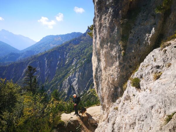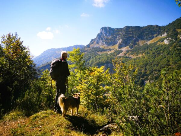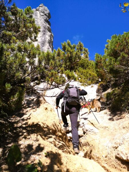 Zwischen Hexen-Busen und -Nase folgen wir dem Bergsteig bergab Richtung Steinerne Agnes. Der Weg liegt am Vormittag in der Sonne und bietet uns immer wieder großartige Blicke auf Watzmann und Hochkalter. In leichtem Auf und Ab wandern wir durch Latschen und Graspuschel. Unser Amos macht immer wieder große Sprünge über umgestürzte Bäume und Felsbrocken am Wegrand. Kleine Abenteuer, wie er sie liebt.