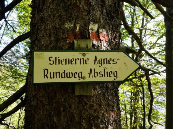 ⚠️ Der Auf- und Abstieg durch die Rinne zum Aussichtspunkt über der Agnes ist sehr rutschig. An der Säule darf nicht geklettert werden. Die Tour eignet sich nicht bei Schnee.