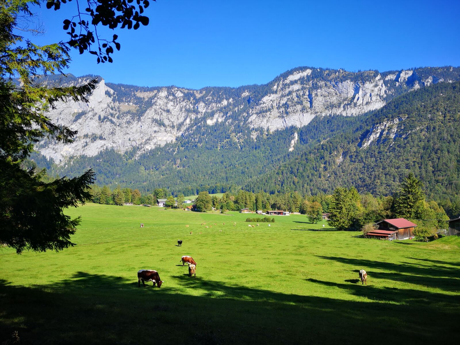 Unser Weg stößt wieder auf den breiten Almweg, den wir schon vom Hinweg kennen. Wenig später erreichen wir unseren Ausgangspunkt, den Wanderparkplatz Hallthurm.