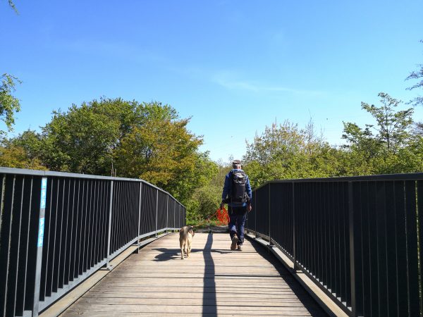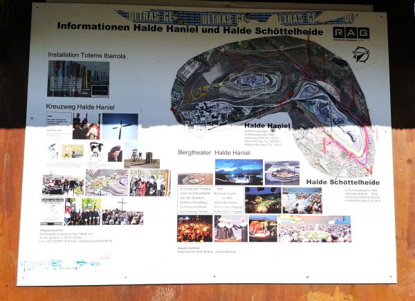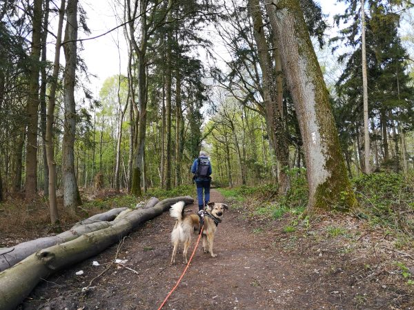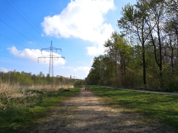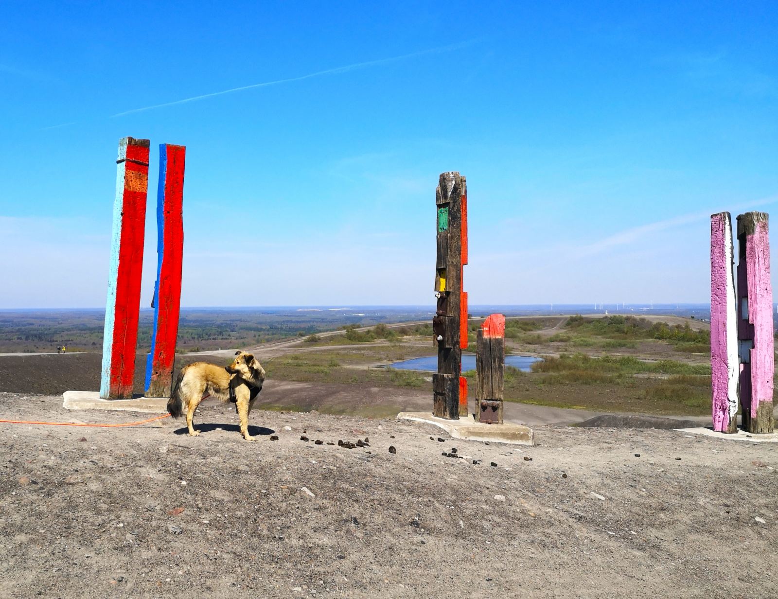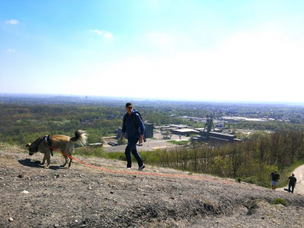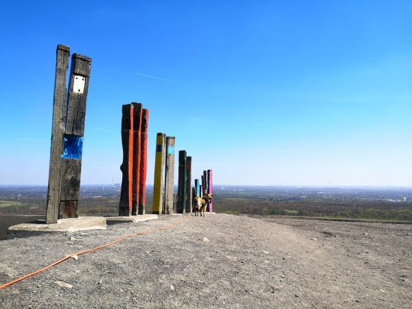 Ausgangspunkt unserer Runde ist das Forsthaus Specht , Oberhausener Straße 391. Neben dem Parkplatz findet sich direkt eine Hundefreilauffläche. Ein schöner Start für den Wauzi, wenn der für wildes Spielen zu begeistern ist. An der Ampelkreuzung gegenüber dem Forsthaus queren wir die Bottroper Straße und stoßen direkt auf die Markierung unseres Wanderweg x 22, dem wir erst einmal folgen. Es geht durch den Wald, vorbei an einem Pferdehof. An der nächsten großen Kreuzung biegen wir rechts ab. Nach einer Planschpause in den Wasserläufen des Spechtsbach erreichen wir bald die erste Halde, die Schöttelheide, die nicht betreten werden darf. Wir biegen rechts ab auf den breiten Wanderweg (Fernewaldstraße), der uns zwischen Halde und Waldrand entlangführt. Bald darauf biegt unser Wanderweg x 22 links ab. Der Schöttelbachweg führt uns über eine kleine Brücke über den gleichnamigen Bach. Wir laufen geradeaus und halten uns bei nächster Gelegenheit wieder links über eine Brücke über den Schöttelbach. Geradeaus, rechts und wieder rechts folgen wir dem breitesten Weg, der jetzt mit x A 1 gekennzeichnet ist. Vor uns sehen wir die Bundesstraße, rechts von uns Weiden mit Kühen, dahinter ein Bauernhof. Bevor wir die Straße erreichen, biegen wir links ab in den Wald. Parallel zur Straße laufend, erreichen wir bald die Grafenmühle – ein Gebiet mit zahlreichen Restaurants, Cafés, Würstchenbuden und Co. Ein beliebtes Ausflugsziel, auch bei Motorradfahrern. Wir legen eine Kaffeepause ein, während Amos Freundlichkeiten von Harley Davidson Fans einstreicht. 🙂 Vorbei am Minigolfplatz verlassen wir die Grafenmühle auf dem Alten Postweg. Bevor wir die Landstraße erreichen, biegen wir links ab auf den beschrankten Waldweg, der mit dem Zeichen X 11 markiert ist. An der nächsten Kreuzung biegen wir rechts ab, laufen ein kurzes Stück parallel zur Landstraße und biegen bei der nächsten Möglichkeit links ab auf den Weg Am Gutshof. Zunächst laufen wir parallel zum Weg auf dem Reitweg, wechseln dann auf den offiziellen Wander- und Fahrradweg. Gegenüber der Infotafel zu den Halden Haniel und Schöttelheide biegen wir rechts ab auf den unmarkierten Weg und laufen am Grund der Halde Haniel entlang. Bevor wir wieder die Landstraße erreichen, biegen wir links ab. Am Fuß der Halde, einen Bach zur Rechten, dahinter die Landstraße, wandern wir weiter geradeaus. Nahe des Parkplatzes an der Kirchhellener Straße kreuzt sich der Weg am Fuß der Halde. Hier beginnt der Aufstieg. Geradeaus ist der Kreuzweg ausgeschildert. Wir halten uns links, vorbei an einer Bank. Auf einem schmalen Hohlweg, der bald in einen recht steilen Waldpfad übergeht, besteigen wir die Halde Haniel, eine enorme Aufschüttung, bleibende Erinnerung an den Steinkohlebergbau. Die Schachtanlage am Fuß der Halde war noch bis 2018 in Betrieb – die letzte im Revier. Wir klettern direkt hinauf auf den Kamm der Halde. Rundumblick über das Ruhrgebiet. Auf dem Kamm hat der baskische Künstler Agostin Ibarrola Bahnschwellen zu Totems umgearbeitet. In starken Farben ragen sie aus dem Sandgrau dieses unwirtlichen Geländes. In der Senke unter dem Totempfählen wartet ein Amphitheater auf die nächste Aufführung. Wir laufen hinunter zum Kreuz aus Spurlatten, geweiht von Johannes Paul II und Ziel der Pilger an der Karfreitagsprozession. Am Kreuz vorbei folgen wir dem Kreuzweg hinab zum Fuß der Halde. Dort halten wir uns links, überqueren die Holzbrücke und folgen dem Wanderweg Fernewaldstraße. Der führt uns zunächst am Bergwerk Prosper Haniel und seinem Förderturm vorbei, dann hinein in den Wald, die Halde zur Linken. Wo die Halde endet, biegen wir rechts ab. Wir laufen wieder zwischen Wald und Halde Schöttelheide entlang, bis wir auf die Kreuzung stoßen, die wir schon vom Hinweg kennen. Ab hier Rückweg wie Hinweg.