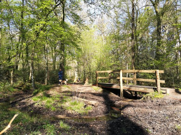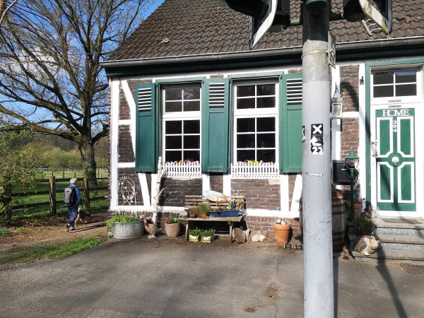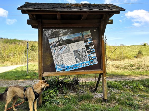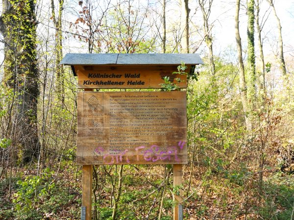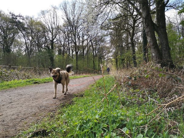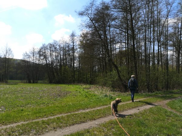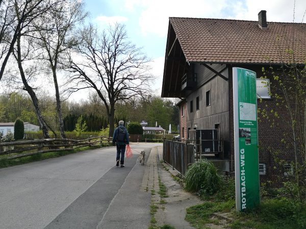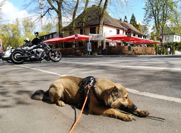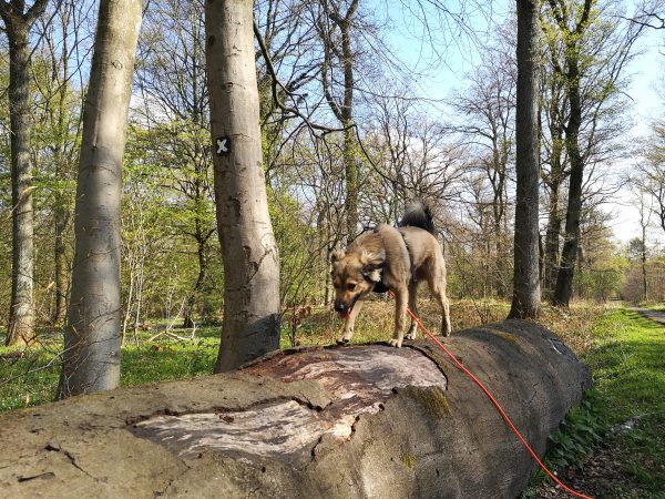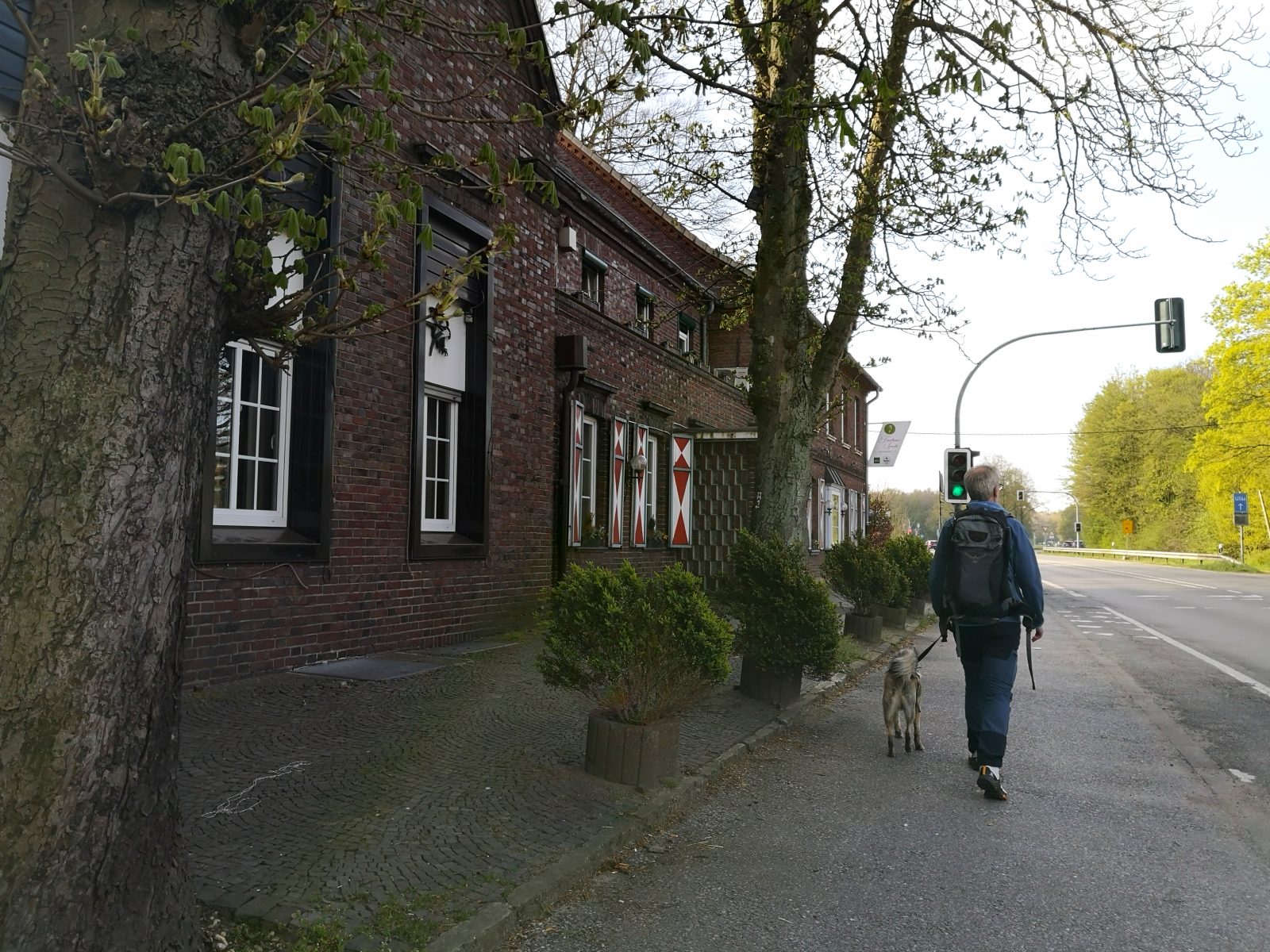 Ausgangspunkt unserer Runde ist das Forsthaus Specht , Oberhausener Straße 391. Neben dem Parkplatz findet sich direkt eine Hundefreilauffläche. Ein schöner Start für den Wauzi, wenn der für wildes Spielen zu begeistern ist. An der Ampelkreuzung gegenüber dem Forsthaus queren wir die Bottroper Straße und stoßen direkt auf die Markierung unseres Wanderweg x 22, dem wir erst einmal folgen. Es geht durch den Wald, vorbei an einem Pferdehof. An der nächsten großen Kreuzung biegen wir rechts ab. Nach einer Planschpause in den Wasserläufen des Spechtsbach erreichen wir bald die erste Halde, die Schöttelheide, die nicht betreten werden darf. Wir biegen rechts ab auf den breiten Wanderweg (Fernewaldstraße), der uns zwischen Halde und Waldrand entlangführt. Bald darauf biegt unser Wanderweg x 22 links ab. Der Schöttelbachweg führt uns über eine kleine Brücke über den gleichnamigen Bach. Wir laufen geradeaus und halten uns bei nächster Gelegenheit wieder links über eine Brücke über den Schöttelbach. Geradeaus, rechts und wieder rechts folgen wir dem breitesten Weg, der jetzt mit x A 1 gekennzeichnet ist. Vor uns sehen wir die Bundesstraße, rechts von uns Weiden mit Kühen, dahinter ein Bauernhof. Bevor wir die Straße erreichen, biegen wir links ab in den Wald. Parallel zur Straße laufend, erreichen wir bald die Grafenmühle – ein Gebiet mit zahlreichen Restaurants, Cafés, Würstchenbuden und Co. Ein beliebtes Ausflugsziel, auch bei Motorradfahrern. Wir legen eine Kaffeepause ein, während Amos Freundlichkeiten von Harley Davidson Fans einstreicht. 🙂 Vorbei am Minigolfplatz verlassen wir die Grafenmühle auf dem Alten Postweg. Bevor wir die Landstraße erreichen, biegen wir links ab auf den beschrankten Waldweg, der mit dem Zeichen X 11 markiert ist. An der nächsten Kreuzung biegen wir rechts ab, laufen ein kurzes Stück parallel zur Landstraße und biegen bei der nächsten Möglichkeit links ab auf den Weg Am Gutshof. Zunächst laufen wir parallel zum Weg auf dem Reitweg, wechseln dann auf den offiziellen Wander- und Fahrradweg. Gegenüber der Infotafel zu den Halden Haniel und Schöttelheide biegen wir rechts ab auf den unmarkierten Weg und laufen am Grund der Halde Haniel entlang. Bevor wir wieder die Landstraße erreichen, biegen wir links ab. Am Fuß der Halde, einen Bach zur Rechten, dahinter die Landstraße, wandern wir weiter geradeaus. Nahe des Parkplatzes an der Kirchhellener Straße kreuzt sich der Weg am Fuß der Halde. Hier beginnt der Aufstieg. Geradeaus ist der Kreuzweg ausgeschildert. Wir halten uns links, vorbei an einer Bank. Auf einem schmalen Hohlweg, der bald in einen recht steilen Waldpfad übergeht, besteigen wir die Halde Haniel, eine enorme Aufschüttung, bleibende Erinnerung an den Steinkohlebergbau. Die Schachtanlage am Fuß der Halde war noch bis 2018 in Betrieb – die letzte im Revier. Wir klettern direkt hinauf auf den Kamm der Halde. Rundumblick über das Ruhrgebiet. Auf dem Kamm hat der baskische Künstler Agostin Ibarrola Bahnschwellen zu Totems umgearbeitet. In starken Farben ragen sie aus dem Sandgrau dieses unwirtlichen Geländes. In der Senke unter dem Totempfählen wartet ein Amphitheater auf die nächste Aufführung. Wir laufen hinunter zum Kreuz aus Spurlatten, geweiht von Johannes Paul II und Ziel der Pilger an der Karfreitagsprozession. Am Kreuz vorbei folgen wir dem Kreuzweg hinab zum Fuß der Halde. Dort halten wir uns links, überqueren die Holzbrücke und folgen dem Wanderweg Fernewaldstraße. Der führt uns zunächst am Bergwerk Prosper Haniel und seinem Förderturm vorbei, dann hinein in den Wald, die Halde zur Linken. Wo die Halde endet, biegen wir rechts ab. Wir laufen wieder zwischen Wald und Halde Schöttelheide entlang, bis wir auf die Kreuzung stoßen, die wir schon vom Hinweg kennen. Ab hier Rückweg wie Hinweg.