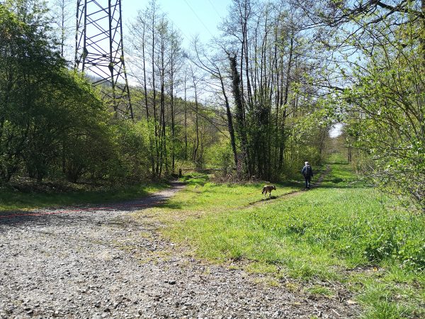 Am Fuß der Halde Haniel, rechts Fluss, dahinter die Landstraße wandern wir an der Westseite der Halde immer geradeaus.