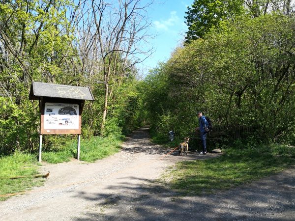 Nahe des Parkplatzes an der Kirchhellener Straße beginnt der Aufstieg. Wir nehmen den linken Weg (nicht den Kreuzweg), an der Bank und der Infotafel vorbei.