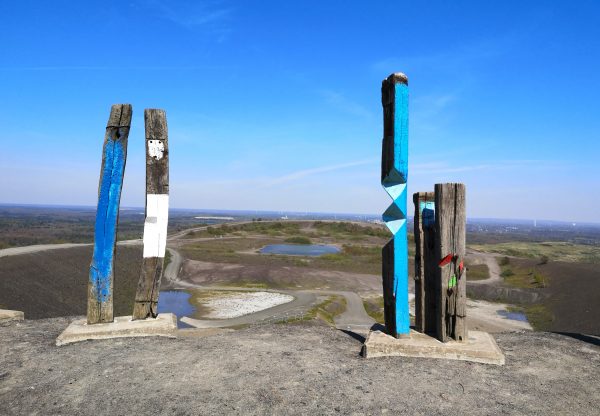 Tatsächlich der Höhepunkt unserer Tour: Auf dem Kamm der Halde Haniel. Amos steht vor den Totems, die der baskischen Künstlers Agostin Ibarrola aus Bahnschwellen gefertig hat. Weit geht der Blick über die enorme Abraumhalde und runderherum über das Ruhrgebiet.