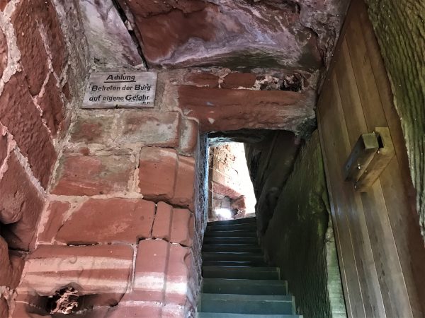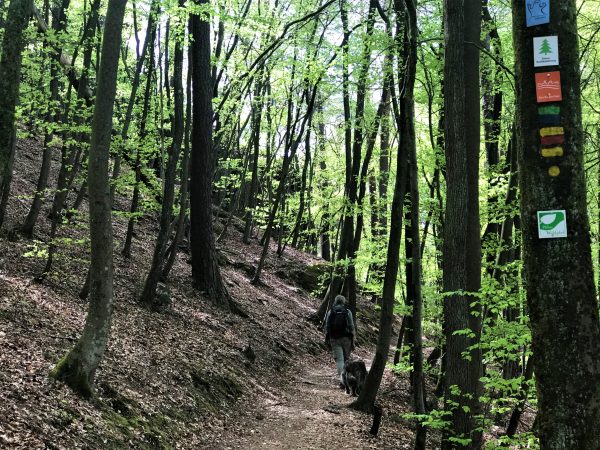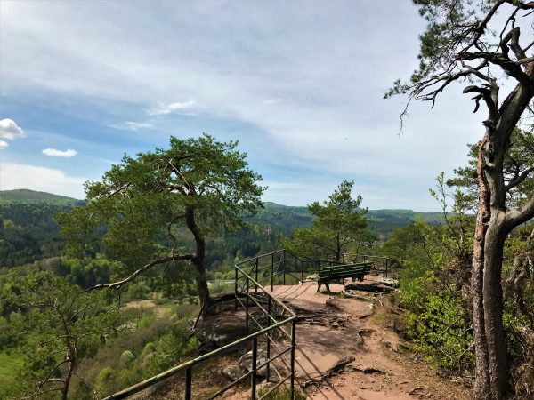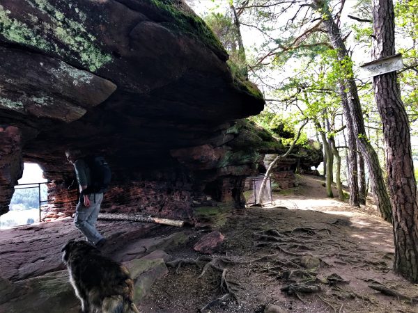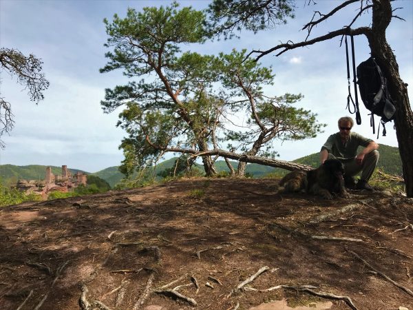 Diese kurze Wanderung verbindet gleich drei aussichtsreiche Höhepunkte: den Rastplatz auf dem Hochberg, die Soldatenhütte und Alt-Dahn, die größte Burgenanlage der Pfalz, die Hunde ganz selbstverständlich mit ihren Menschen entdecken dürfen. Abenteurer-Naturen fügen noch einen vierten Aussichtspunkt hinzu. Der Haferfelsen liegt auf einer vorgelagerten Felsnase, von der sich ein wunderbarer Blick auf Altdahn bietet und wird offenbar auch für Übernachtungen genutzt. Aber Vorsicht: Der Abstecher dorthin führt – anders als der Rest der Strecke – über einen nicht ausgeschilderten Pfad, der an einer Stelle ausgesetzt ist. Mensch und Hund sollten also trittsicher sein.
