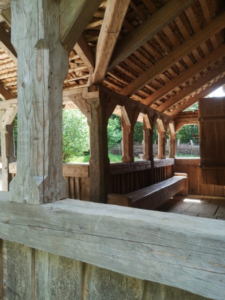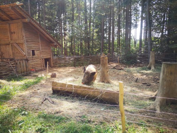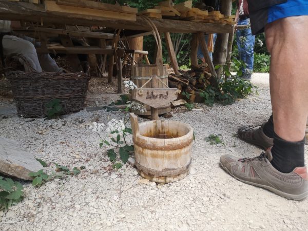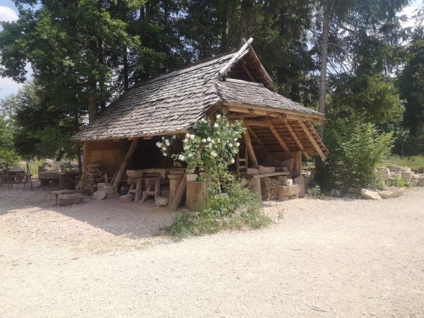 Auf der Baustelle wird eine Klosteranlage mit Mitteln des 9. Jahrhunderts gebaut. Bereits fertig sind eine Holzkirche, eine große Scheune und rund ein Dutzend Handwerker-Hütten, von der Schmiede über die Steinmetzhütte bis zur Weberei. In den Gebäuden wird fleißig gearbeitet, trotzdem nehmen sich die Handwerker:innen alle gut gelaunt Zeit für alle Fragen rund um das Dorf und ihr Handwerk. Die Hunde nutzen die längeren Schwätzchen um auf dem kühlen Waldboden zu dösen und sind im übrigen bestens versorgt: Vor fast jeder Hütte steht ein Wassernapf, zweimal werden wir auch direkt angesprochen, dass wir einfach Bescheid sagen sollen, falls der Eimer nicht mehr voll genug sein sollte.