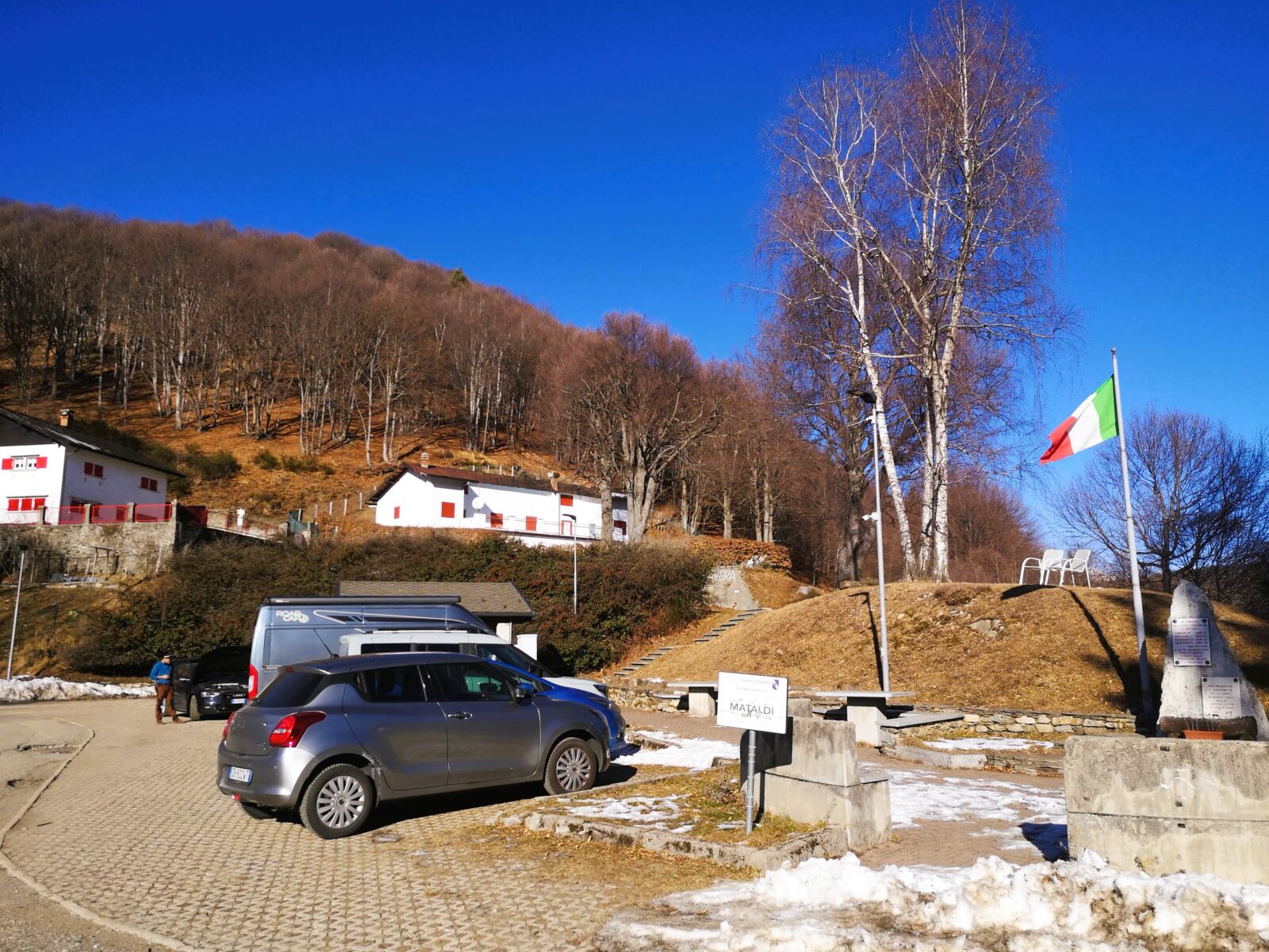 🚗 Zum Ausgangspunkt „Il Colle“ gelangen wir mit dem Auto ab Cannero Riviera. Wir folgen der schmalen Straße bergauf über Trarego. Im Ortsteil Cheglio sehen wir den Wegweise Richtung „Colle“ rechts ab. Wir folgen dem kaum befahrenen Sträßchen gut 11 km meist bergauf (vorbei am Zipline-Park, zahlreichen Bergbauernhöfen und Alphütten). Schließlich erreichen wir nach einer Kurve einen großen Parkplatz mit Picknickbänken, Brunnen, Fahnenstange und Infotafeln zum Wandergebiet.