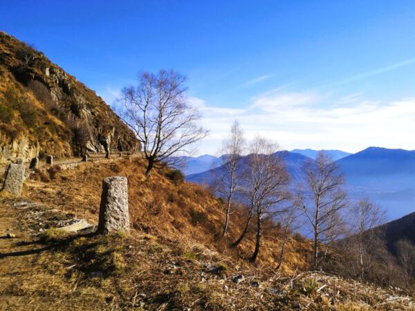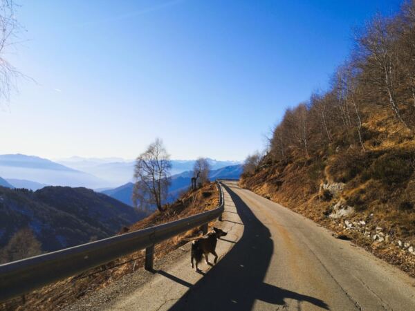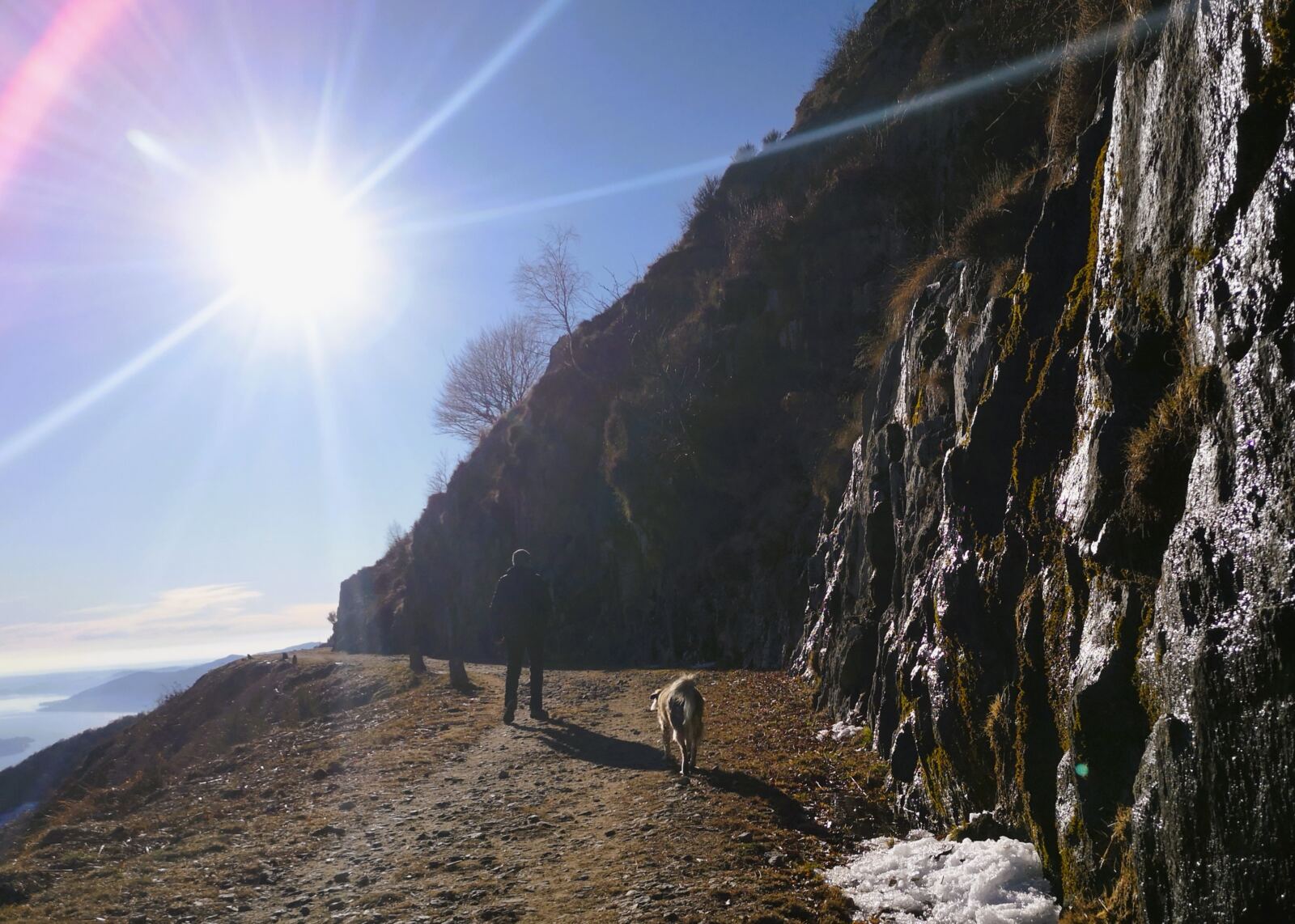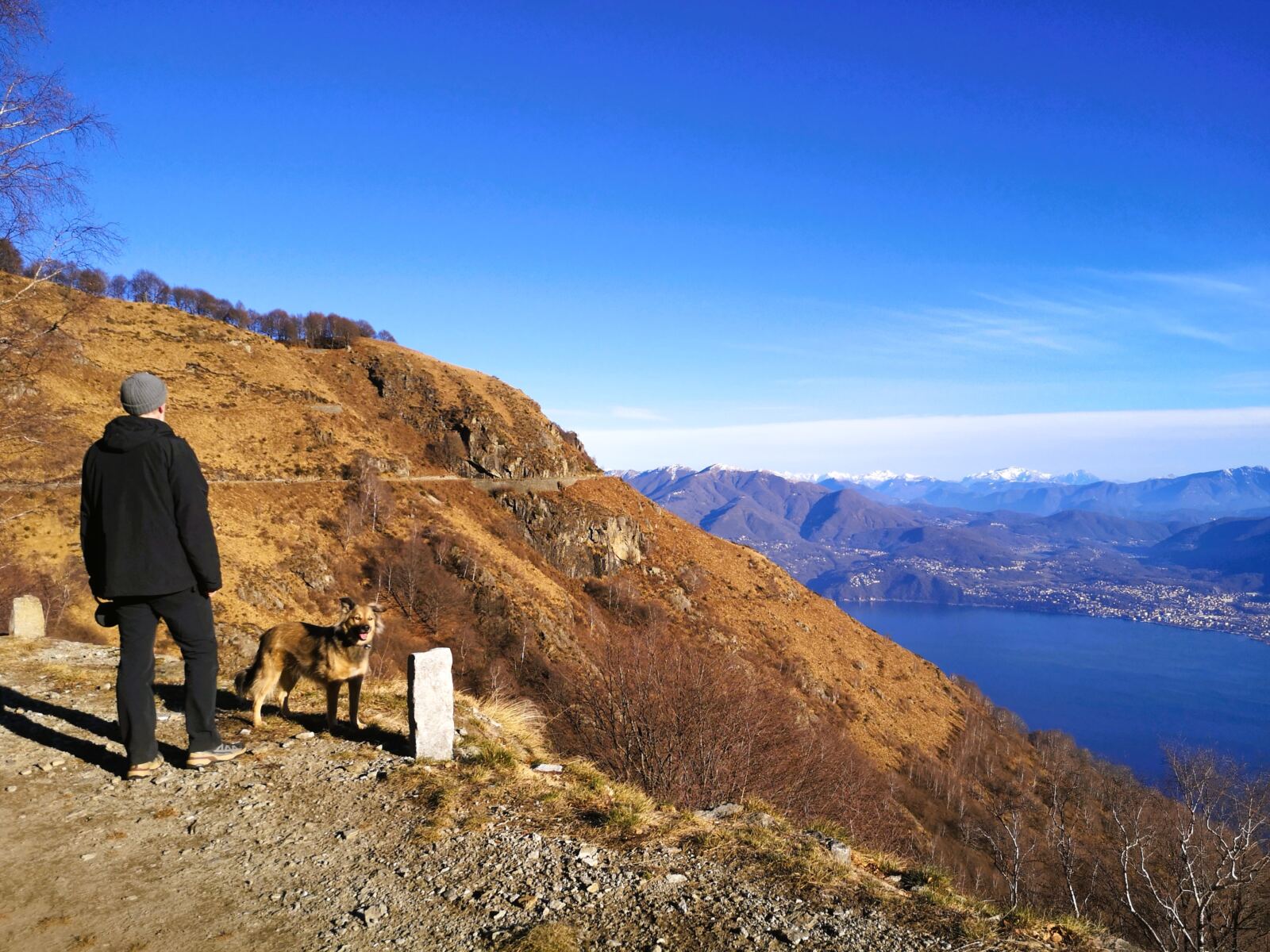 Unsere kleine Wanderung verbindet Natur und Geschichte mit tollen Ausblicken auf den ganzen See. 🤩🐕 Viel zu Schauen für wenig Anstrengung. Für Hund und Mensch problemlos zu meistern. Bis auf die letzten Meter zum Gipfel, der kurz und etwas steil ist, gibt es kaum Steigungen. Wir sind zunächst auf laubbedeckten Waldwegen unterwegs, dann auf einem breiten sandigen Balkonweg, die einstige Militärstraße der „Linea Cardona“. Zurück laufen wir auf dem kaum befahrenen Teesträßchen, das hauptsächlich als Zufahrt zu einem Klinikkomplex für Wachstumsstörungen und Adipositas genutzt wird.