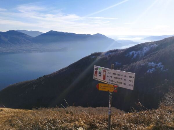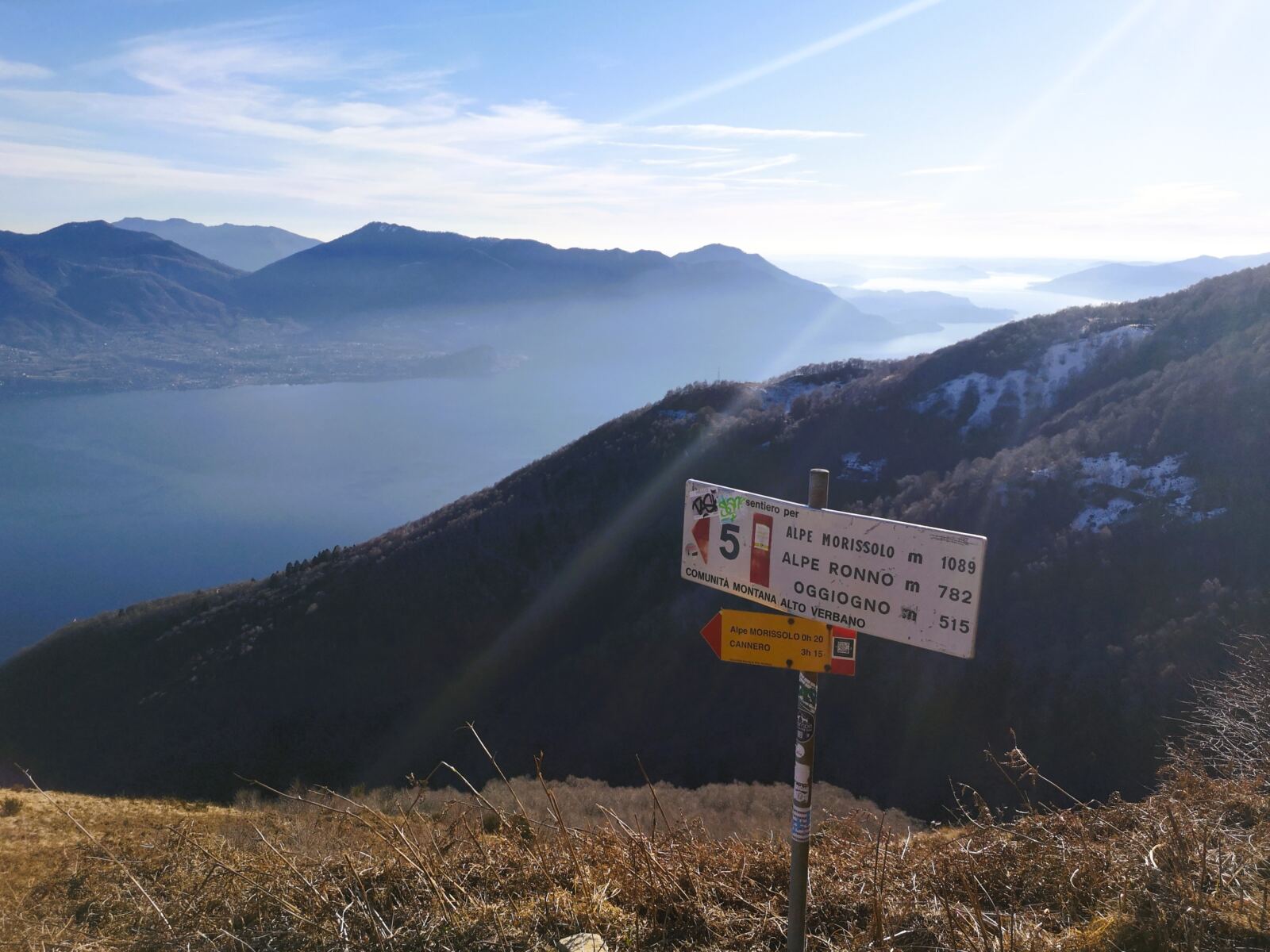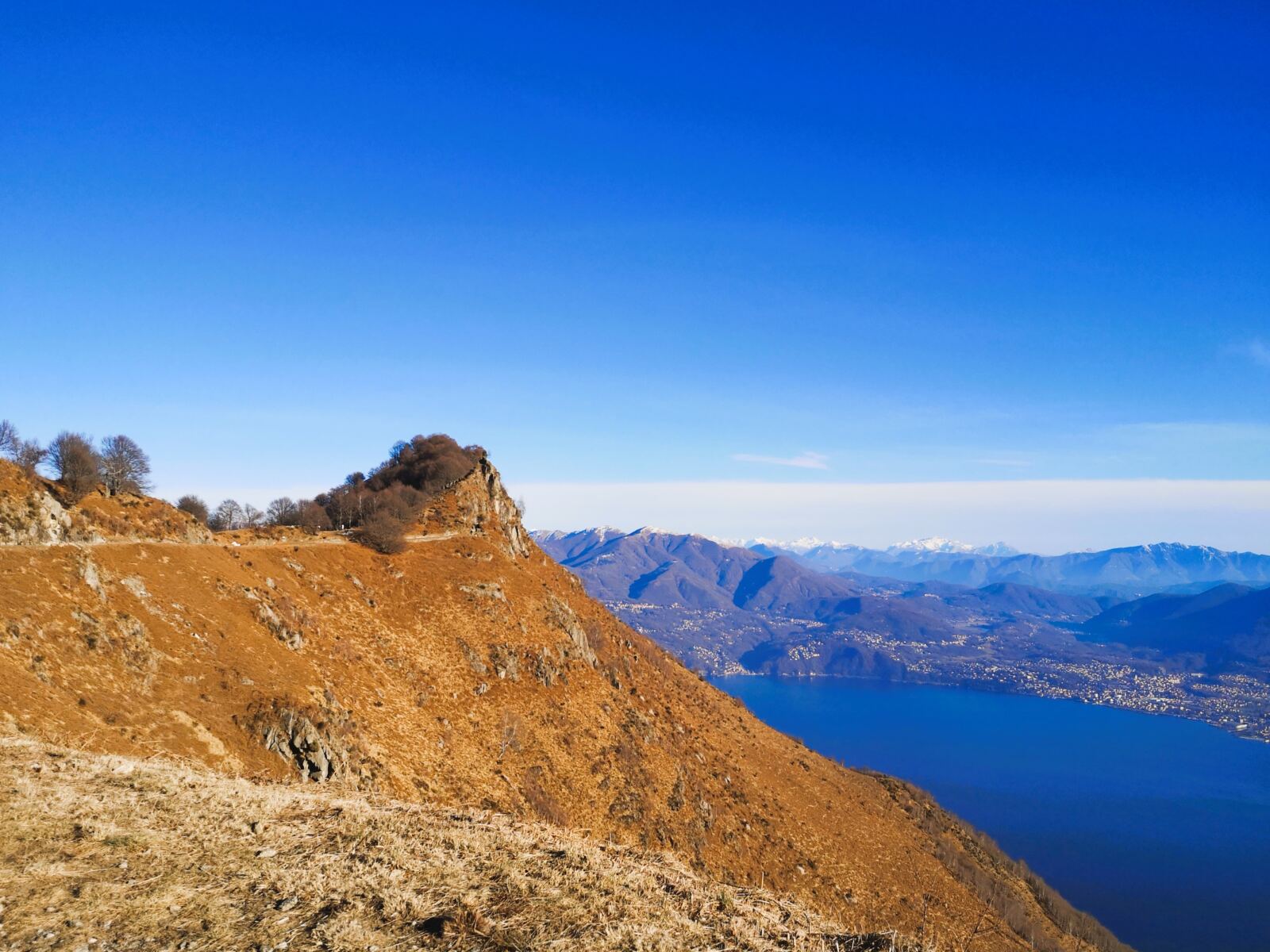 🗺️Wegbeschreibung: Vom Parkplatz „Il Colle“ überqueren wir die Straße, auf der wir gekommen sind. Links neben einem Brunnen am Straßenrand folgen wir dem rot-weiß-rot markierten Wanderweg Richtung Monte Morissolo (gallerie) geradeaus durch den Laubwald. Eine gute dreiviertel Stunde wandern wir auf dem schönen schmalen Pfad durch den Wald – und erreichen schließlich offenes Gelände. Rechts von uns führt die alte Militärstraße „Linea Cardona“ am Berg entlang, unter uns liegt der See in der Sonne, links von uns führt ein schmaler, recht steiler Pfad hinauf auf die Cima di Morossolo. Wir folgen dem Pfad, der zeitweise kaum zu erkennen ist. An einer Kreuzung halten wir uns rechts und steigen hinauf zum Gipfel. Hier hätten wir uns aber offensichtlich links und geradeaus halten müssen, um den offiziellen Gipfel mit den 3 Gipfelkreuzen zu erreichen. Auch vom falschen Gipfel ist die Aussicht auf den kompletten See traumschön. ⚠️🐕🦺 Achtung: Hier fallen die Wände teils sehr steil ab. Übermütige Hunde sollte man nahe bei sich und an der Leine halten.