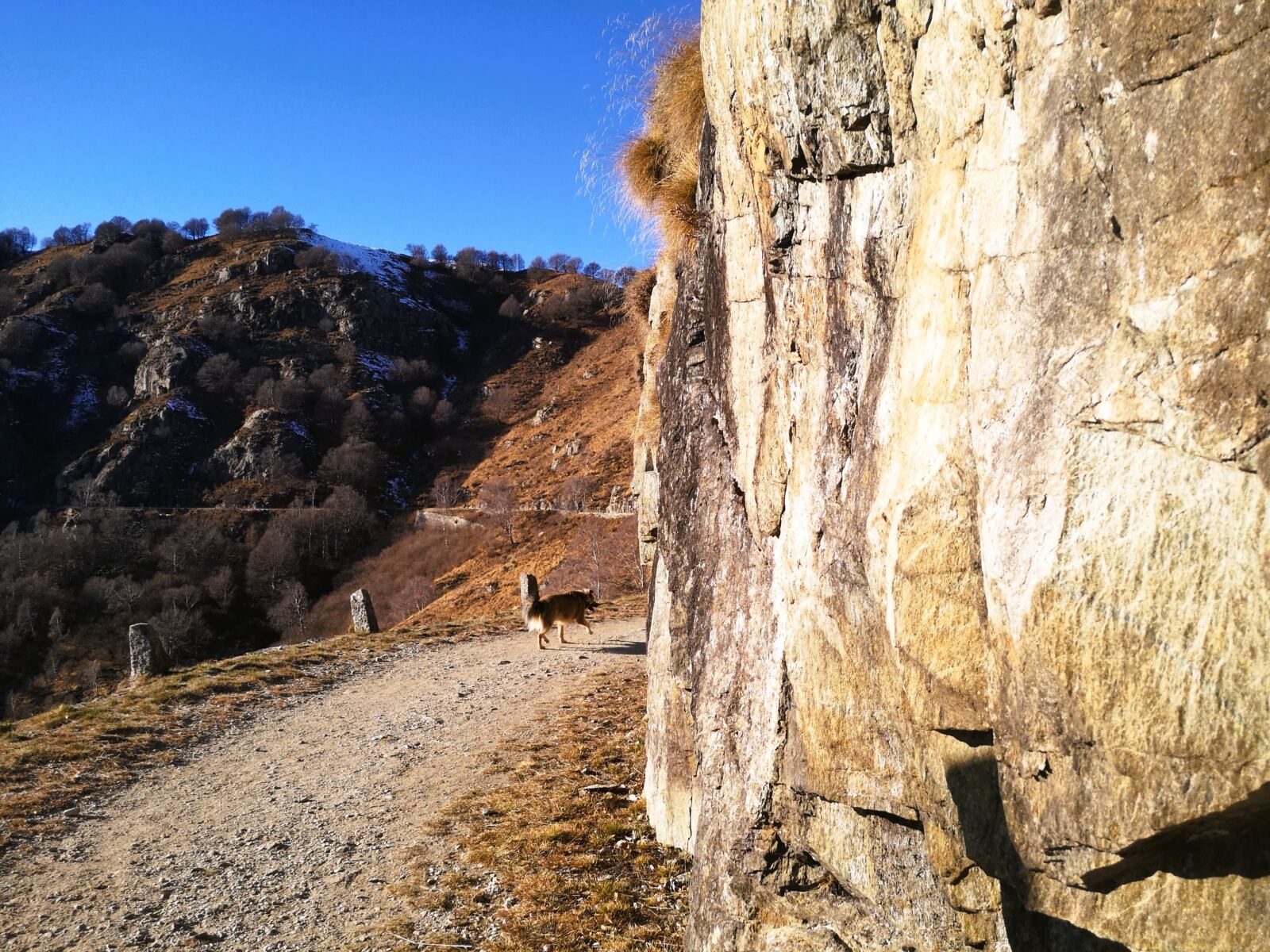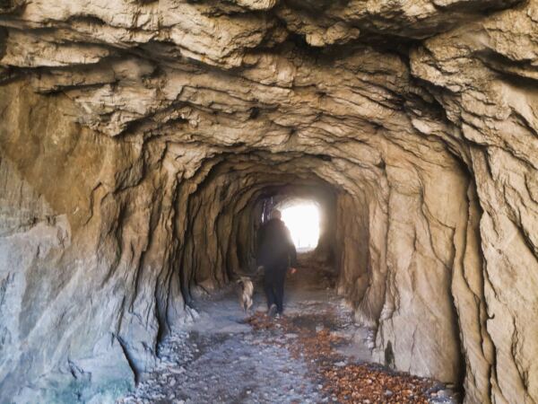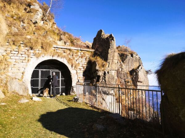Wir steigen hinab vom Gipfel. Bevor wir uns nach rechts wenden und auf der Militärstraße weitergehen, folgen wir dem breiten Weg nach links um den Gipfelaufbau. Hier erreichen wir nach wenigen Schritten den Durchgang zum ersten Tunnel in den Berg. Infotafeln erzählen auf Italienisch und Englisch von der einst mächtigen Anlage, an der unter der Leitung des Militärführers Luigi Cadorna rund 20.000 Menschen arbeiteten. Mit unserem Hund an der Leine durchlaufen wir einige Tunnel, steigen Treppen bergauf und spähen durch Schießscharten über den See und in die Berge – für unseren Vierbeiner ein willkommenes Abenteuer, für uns ein Abstecher in die Geschichte, der nachdenklich stimmt.