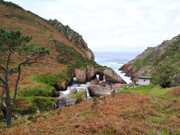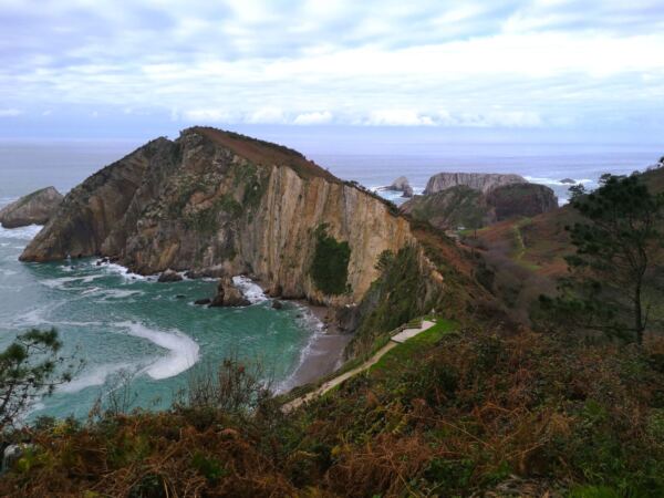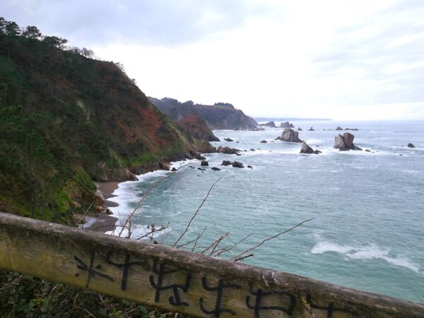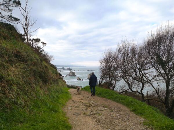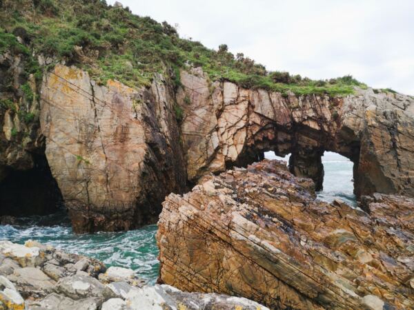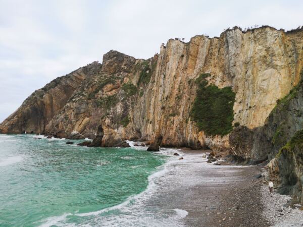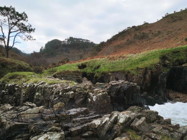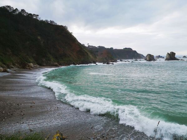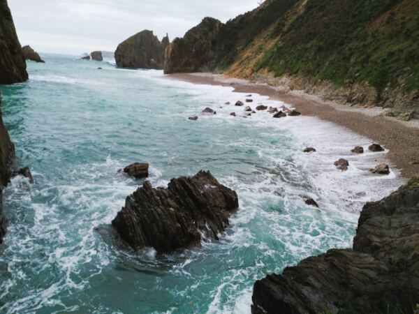 An der Westküste Asturiens nahe der kleinen Gemeinde Castañeras liegt die Playa de Silencio, die Bucht der Stille – für uns ein magischer Ort. Die muschelförmige Bucht mit ihrem Kieselstrand, rund 500 Meter lang, säumen steil abfallende Quarzitklippen. Vor der Bucht ragen Inselchen wie scharfe Zähne aus dem Meer. Das Wasser um die Inseln ist glasklar und changiert in allen Farben von hellstem Türkis bis dunklem Blau. Neben der Playa liegt offenes Grasland. Ein Bach gurgelt hindurch zum Meer und der Playa La Caldoria mit ihren Felsen, darin ein natürlicher Torbogen, durch den die Wellen gischten. Geolog*innen und Geograf*innen lieben die Playa de Silencio. Hier lassen sich die Prozesse besonders gut studieren, die über Jahrmillionen die Küstenlinie modelliert haben. Noch vor einigen Jahren galt die Playa de Silencio, wohl wegen ihrer Möwenkolonie von Einheimischen auch „Playa de Gavieiru“ genannt, als Geheimtipp. In den Sommermonaten reihen sich nun die Autos an der Zufahrtsstraße und die Bauernhöfe in der Nähe vermieten ihre Wiesen als Parkplatz. Wir waren mit unserem Hund im Winter hier – zwar nicht allein, aber die wenigen Besucher verstreuten sich über das Gelände. Und nur wenige laufen vor bis zur Playa La Caladoria.
