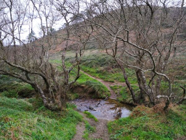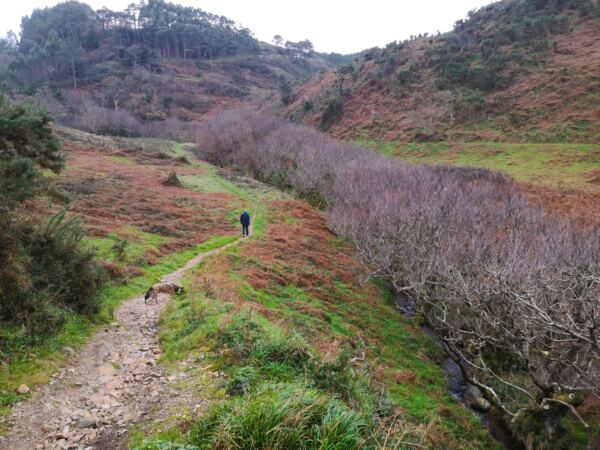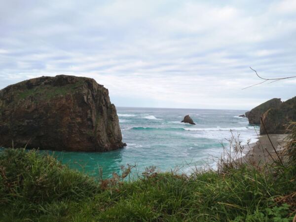 Wir steigen die Treppe wieder hinauf. Gegenüber der Bucht startet ein schmaler Wanderpfad recht steil bergab durch das Grasland. Ihm folgen wir. Wir laufen durch die weltentrückte Landschaft, die Amos genauso gut gefällt wie uns. Bald erreichen wir eine winzige Brücke, die uns über einen baumbestandenen Bach bringt. Der Bach führt uns in die kleine Playa La Caldoria. Hier strudelt er durch eine felsige Rinne ins Meer. Durch einen steinernen Torbogen branden ihm die Wellen entgegen. Auf der Wiese daneben hocken zwei Frauen auf Picknick-Decken und malen das Naturschauspiel. Wir gehen ein paar Schritte nach rechts und blicken auf die breite Playa de Baquera hinab. Wer gut zu Fuß ist, kann hier den kurzen Weg den Fels hinab zum Strand klettern.