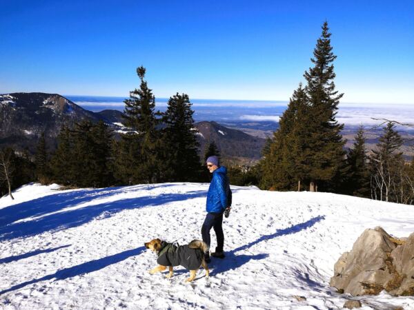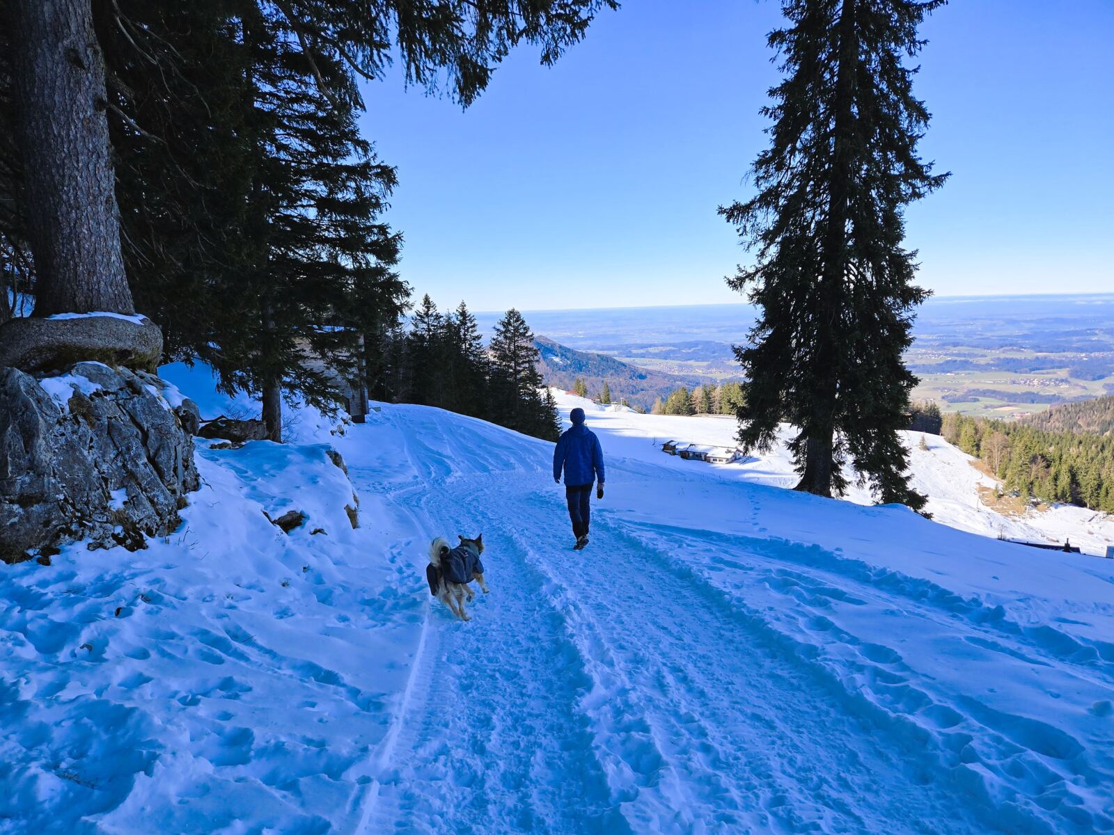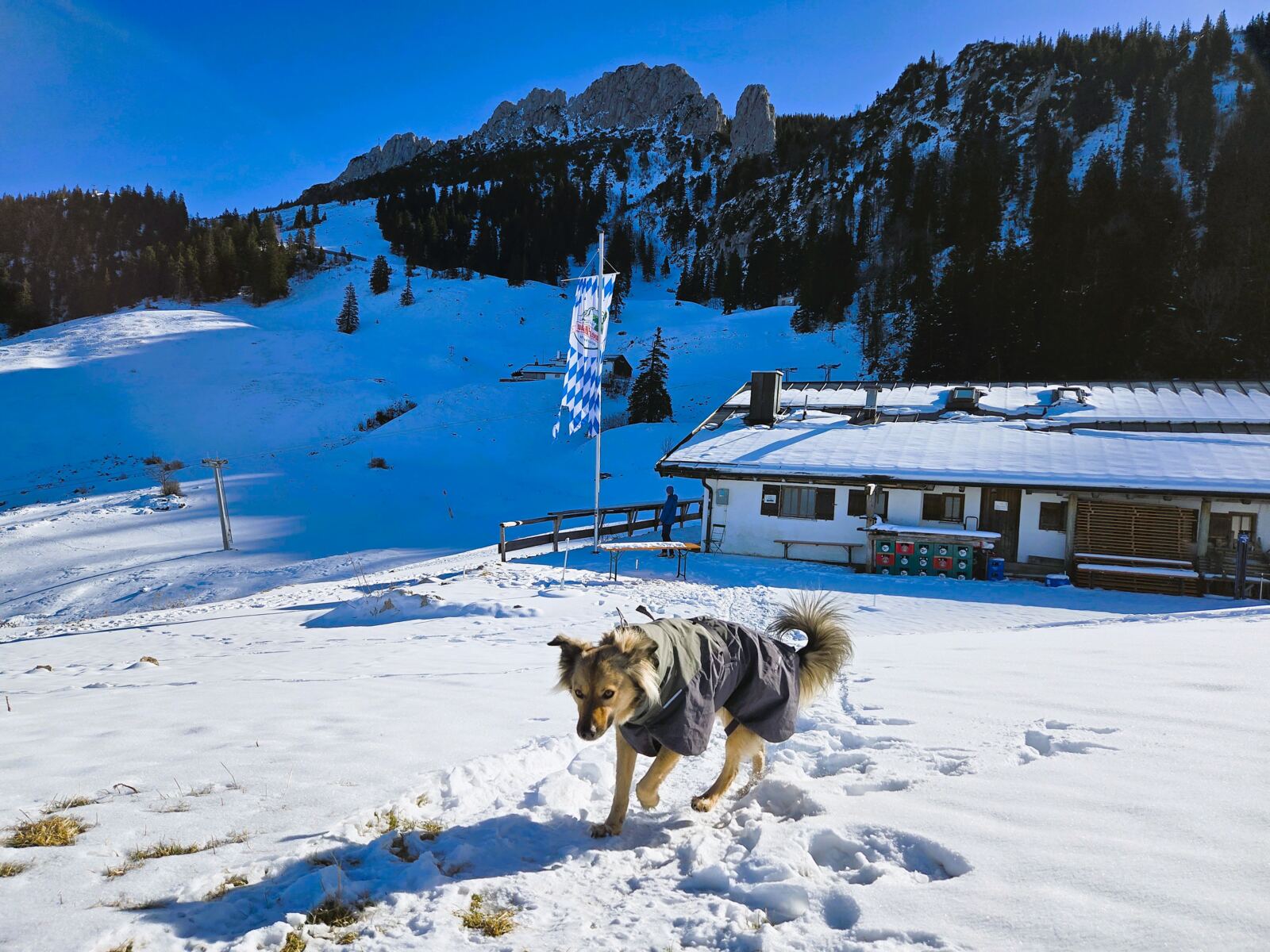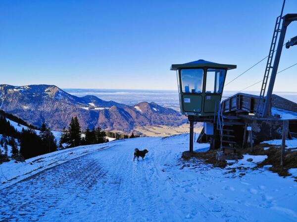 Ausgangspunkt unserer Tour ist die Talstation der Kampenwandseilbahn in Hohenaschau. Auf dem großen Parkplatz lässt sich auch ein Wohnmobil abstellen. Die Kabinen bieten Platz für zwei Erwachsene und zwei große Hunde. Nach einiger Übung steigt Amos mittlerweile beherzt hinein. Wir genießen das Schweben den Berg hinauf und hinein in eine Winterlandschaft. Nach knapp 15 min. erreichen wir die Bergstation auf rund 1.500 Metern Höhe.