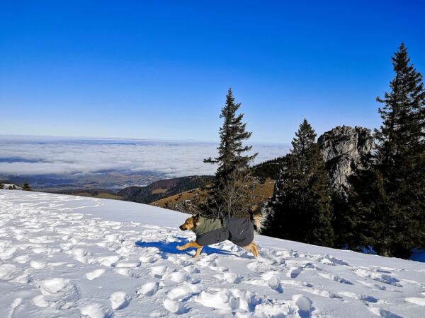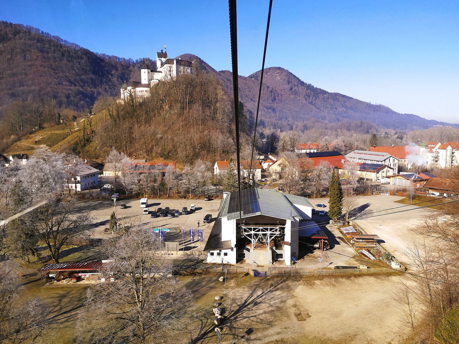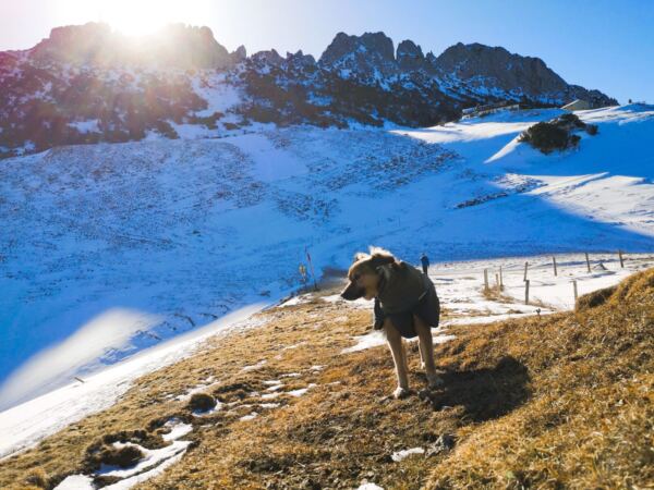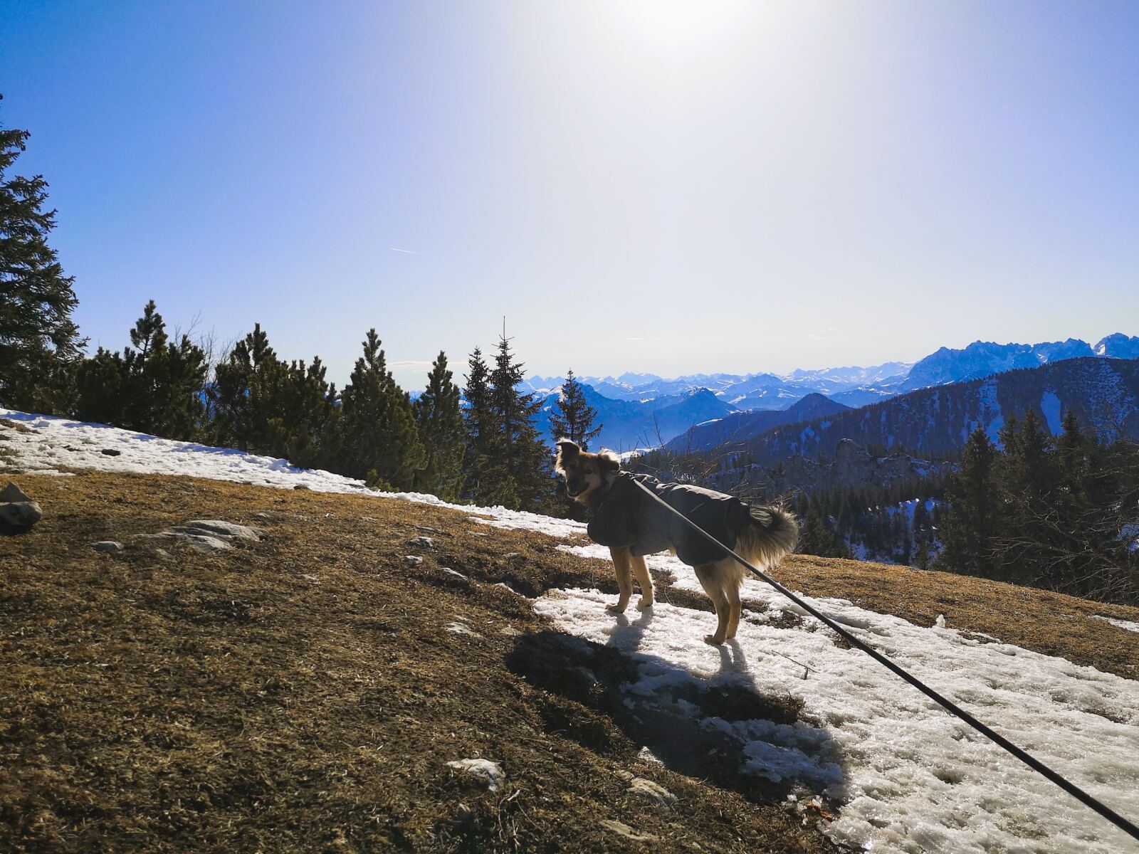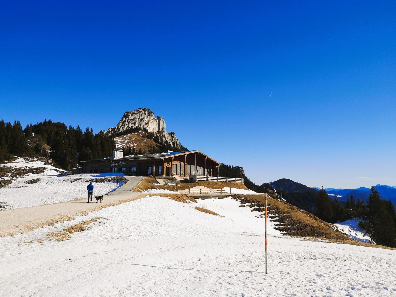 Ausgangspunkt unserer Tour ist die Talstation der Kampenwandseilbahn in Hohenaschau. Auf dem großen Parkplatz lässt sich auch ein Wohnmobil abstellen. Die Kabinen bieten Platz für zwei Erwachsene und zwei große Hunde. Nach einiger Übung steigt Amos mittlerweile beherzt hinein. Wir genießen das Schweben den Berg hinauf und hinein in eine Winterlandschaft. Nach knapp 15 min. erreichen wir die Bergstation auf rund 1.500 Metern Höhe.