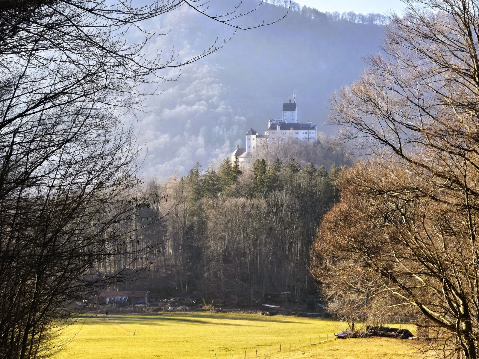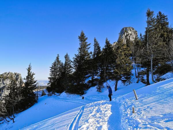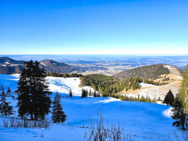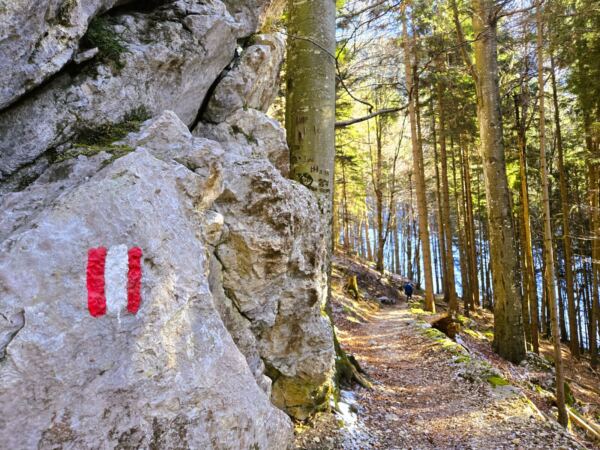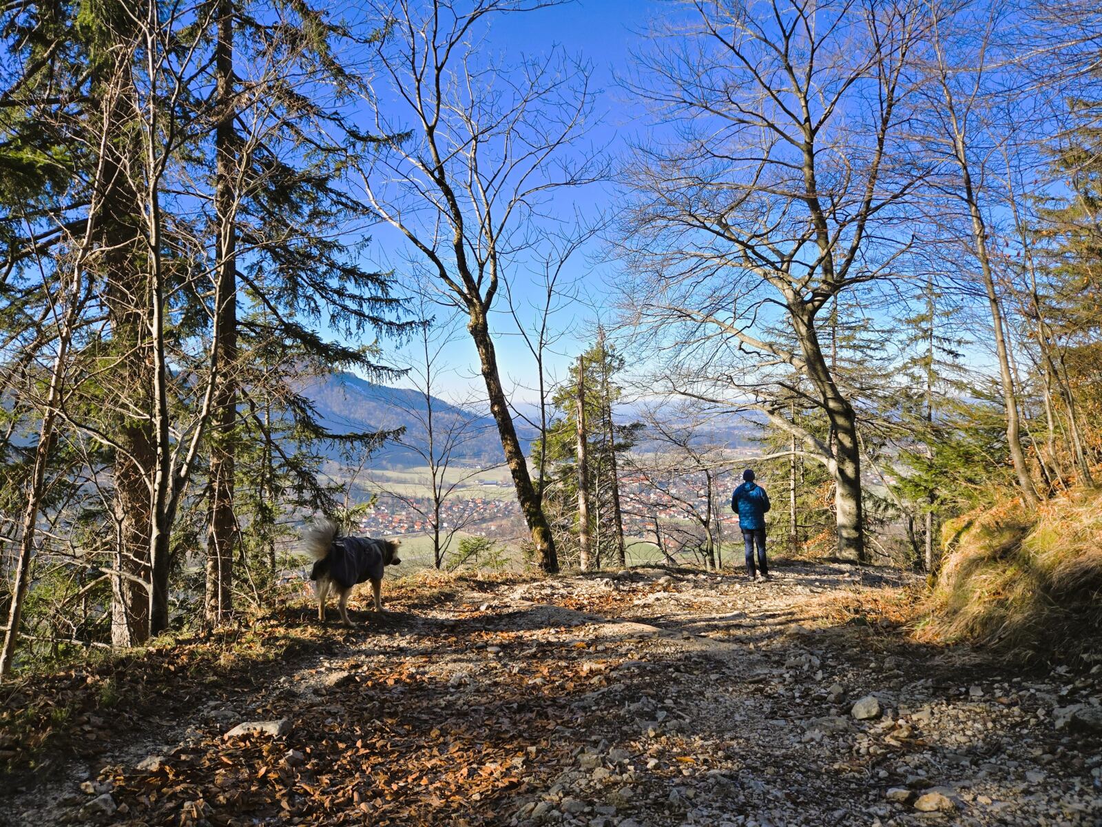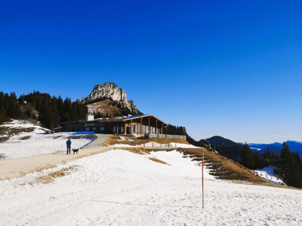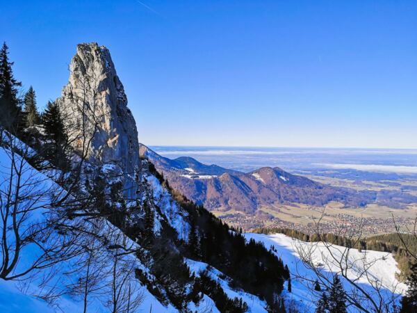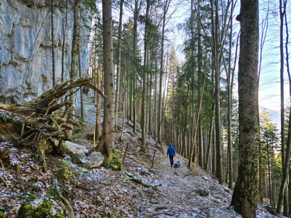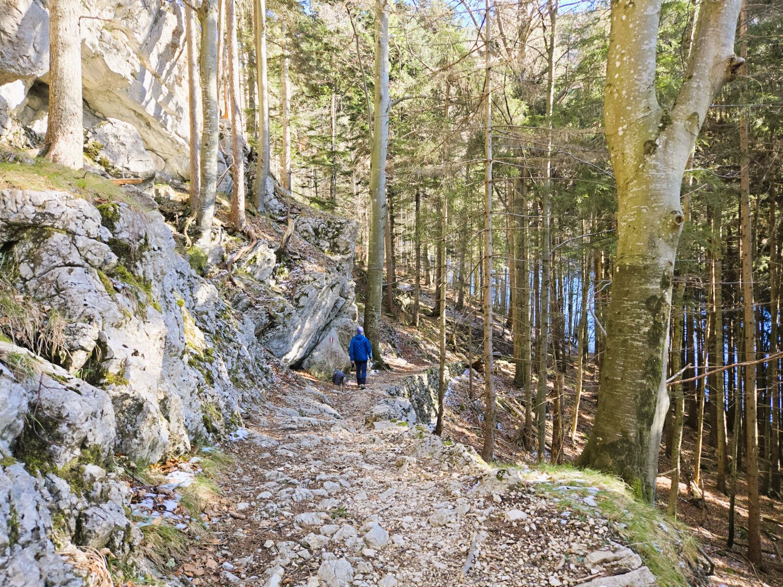 Unser Wanderung führt zunächst fast eben über den Panoramaweg, der fast eben wie ein Balkon um den Gipfel herumführt und grandiose Ausblicke auf das Alpenvorland und den Chiemsee bietet. Danach geht’s immer weiter bergab, zunächst über eine Almstraße, bald schon über gut begehbare, doch herrlich wilde Steige, gesäumt von Felswänden und abgebrochenen Steinblöcken, auf denen schon wieder Bäume wachsen. Sollte noch zu viel Schnee die Steige unpassierbar machen, können wir bequem auf den Forstwegen ins Tal wandern. Unterwegs zunächst ganz viel Sonne, dann lichter Waldschatten. Einige Almen entlang des Wegs wie die Steinlingalm sind fast ganzjährig bewirtschaftet.