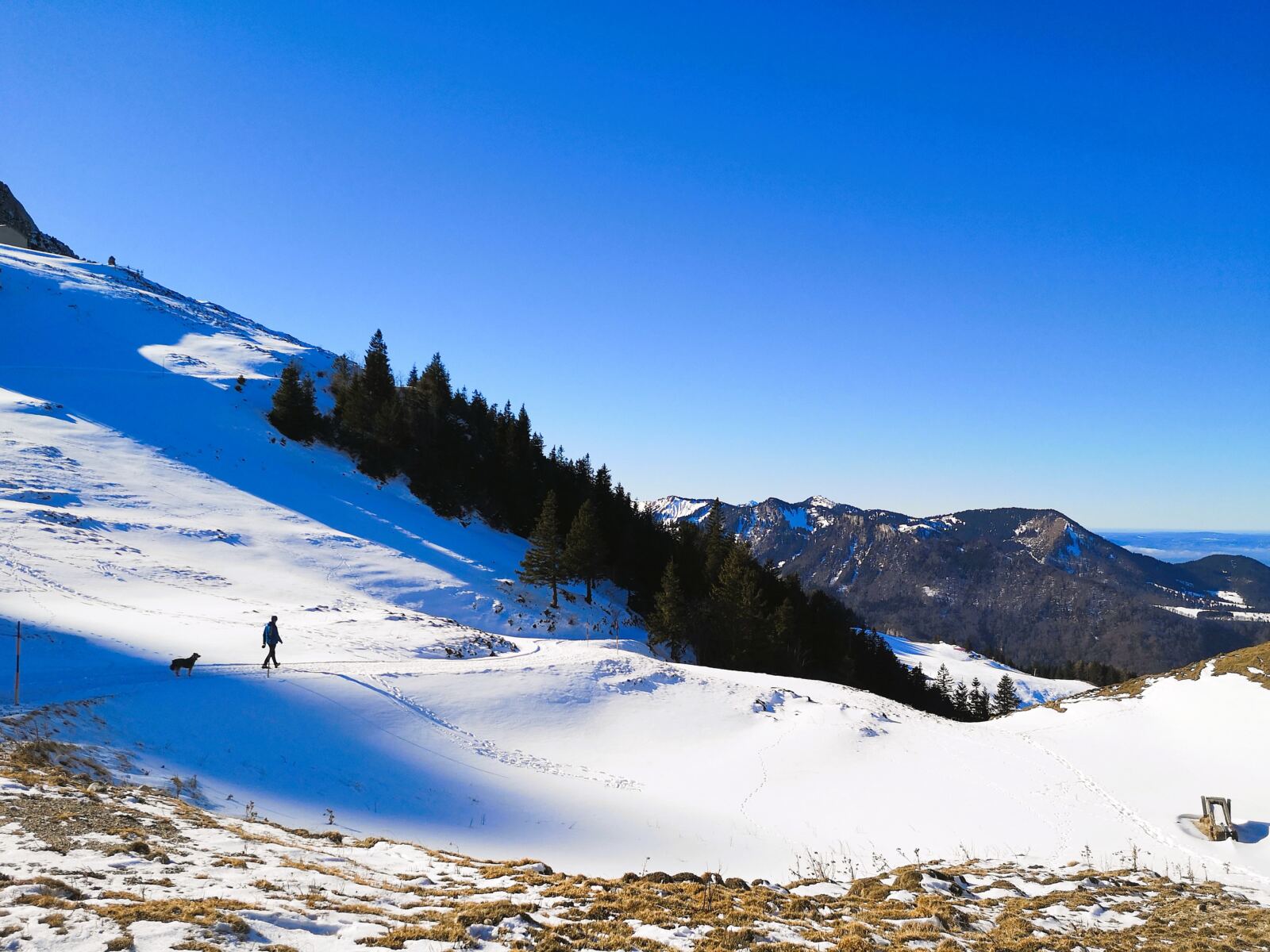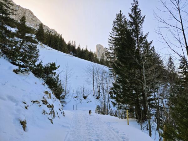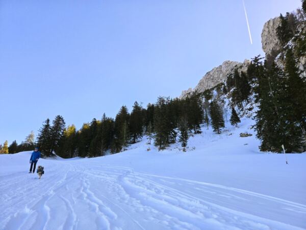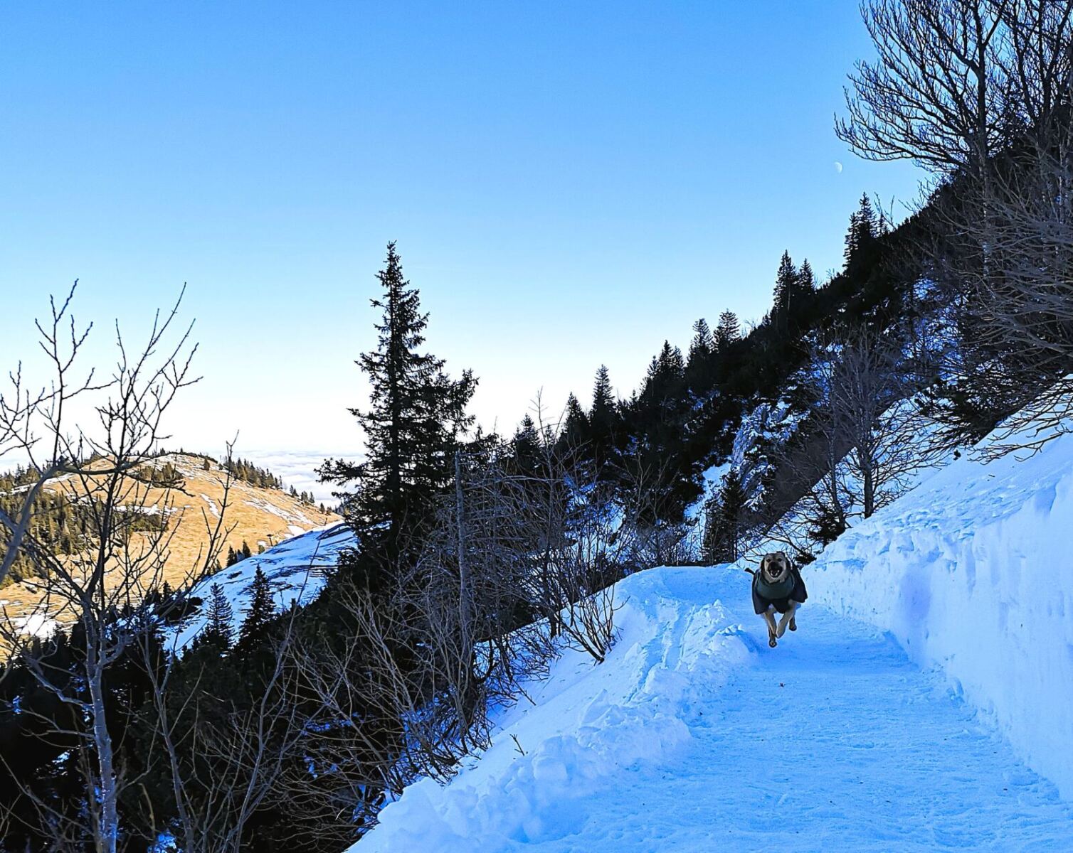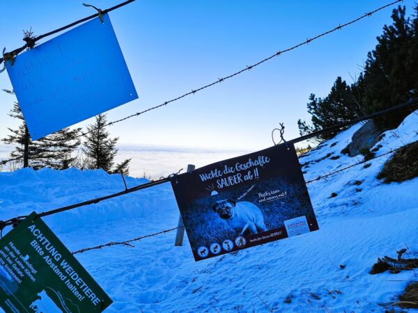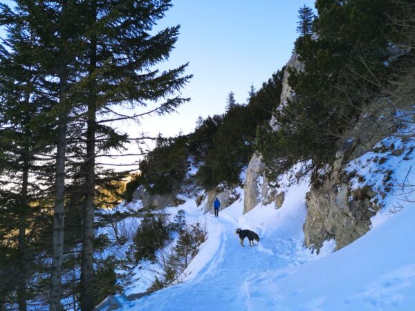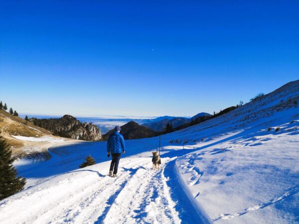 Die Bergstation im Rücken halten wir uns links Richtung Sonnenalm. Wir folgen dem Wanderweg ein kurzes Stück bergauf zu einem Andachtskreuz. Unser Weg verläuft nun kaum merkbar fallend um den Hahnenkamm der Kampenwand herum. Traumschön hier. Findet auch unser Hund, der im Galopp durch den Schnee peitscht. Bald passieren wir einen Weidezaun, der uns um diese Jahreszeit nicht weiter kümmert.